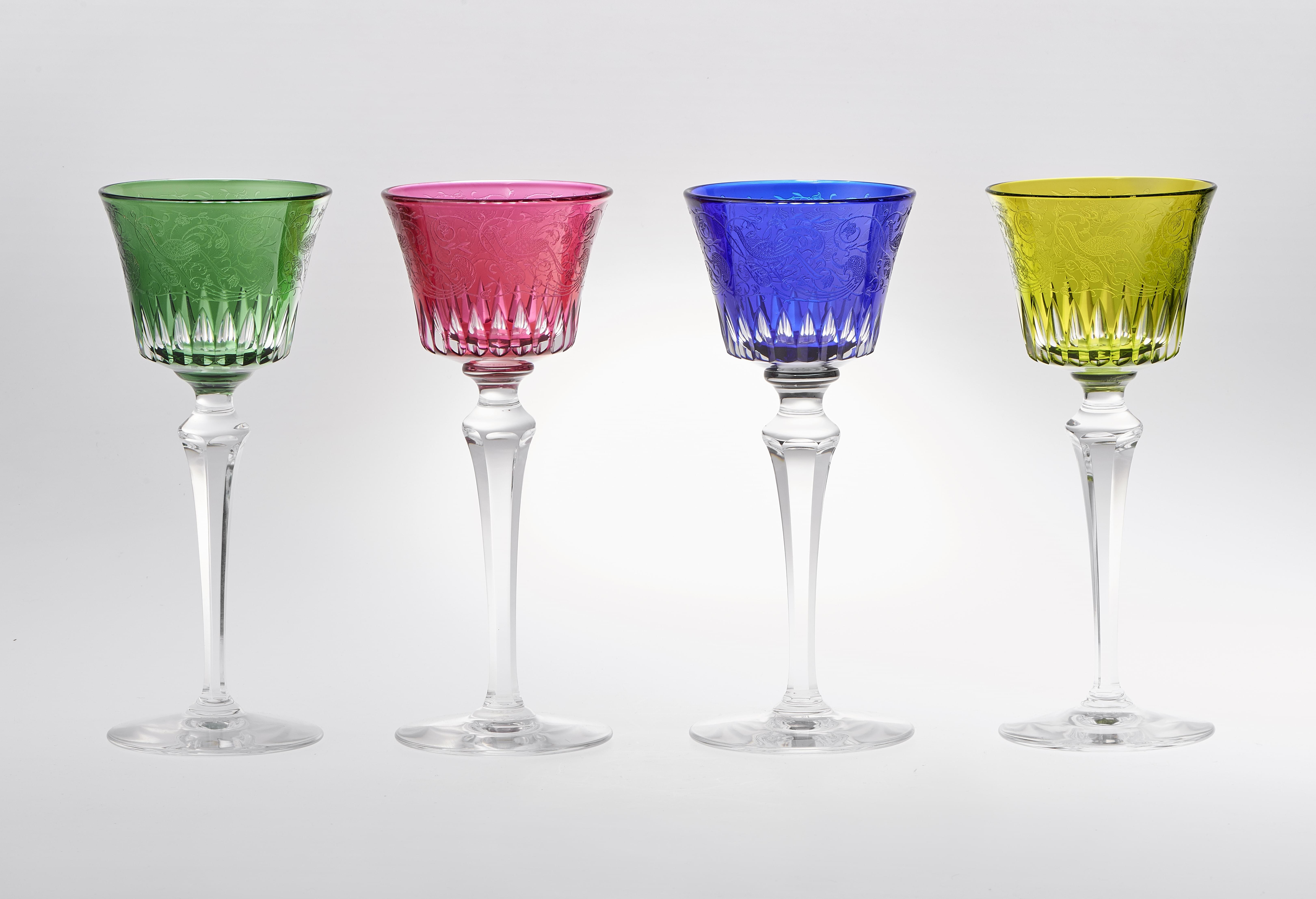 519. Suite de 12 verres à vin colorés à décor gravés de paons dans des rinceaux