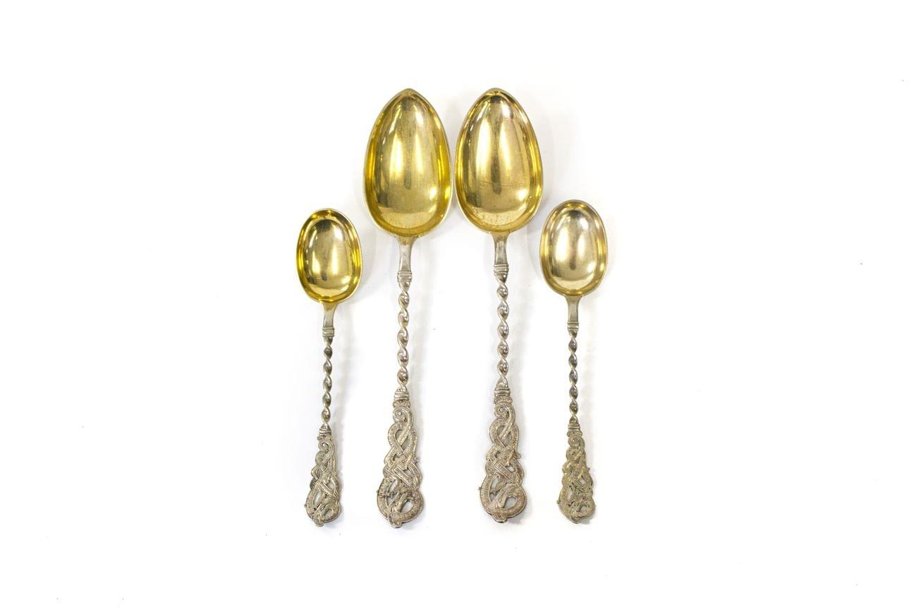3455. Suite de deux paires de cuillères à motif ajouré de dragon celtique