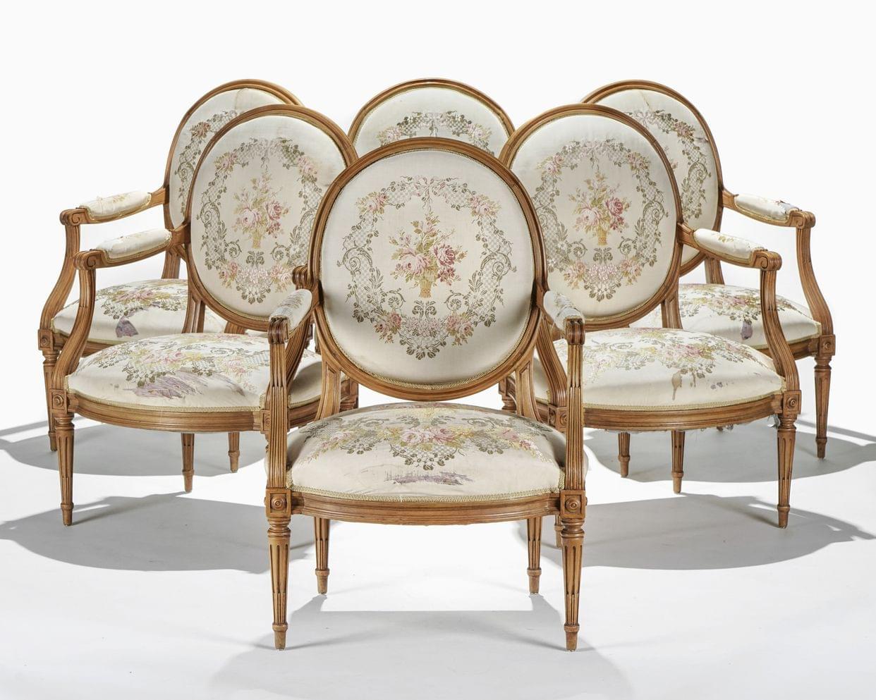 Dossier médaillon, hêtre mouluré et sculpté (deux fauteuils avec l'estampille visible). Jean-Baptiste Boulard, reçu maître en 1754