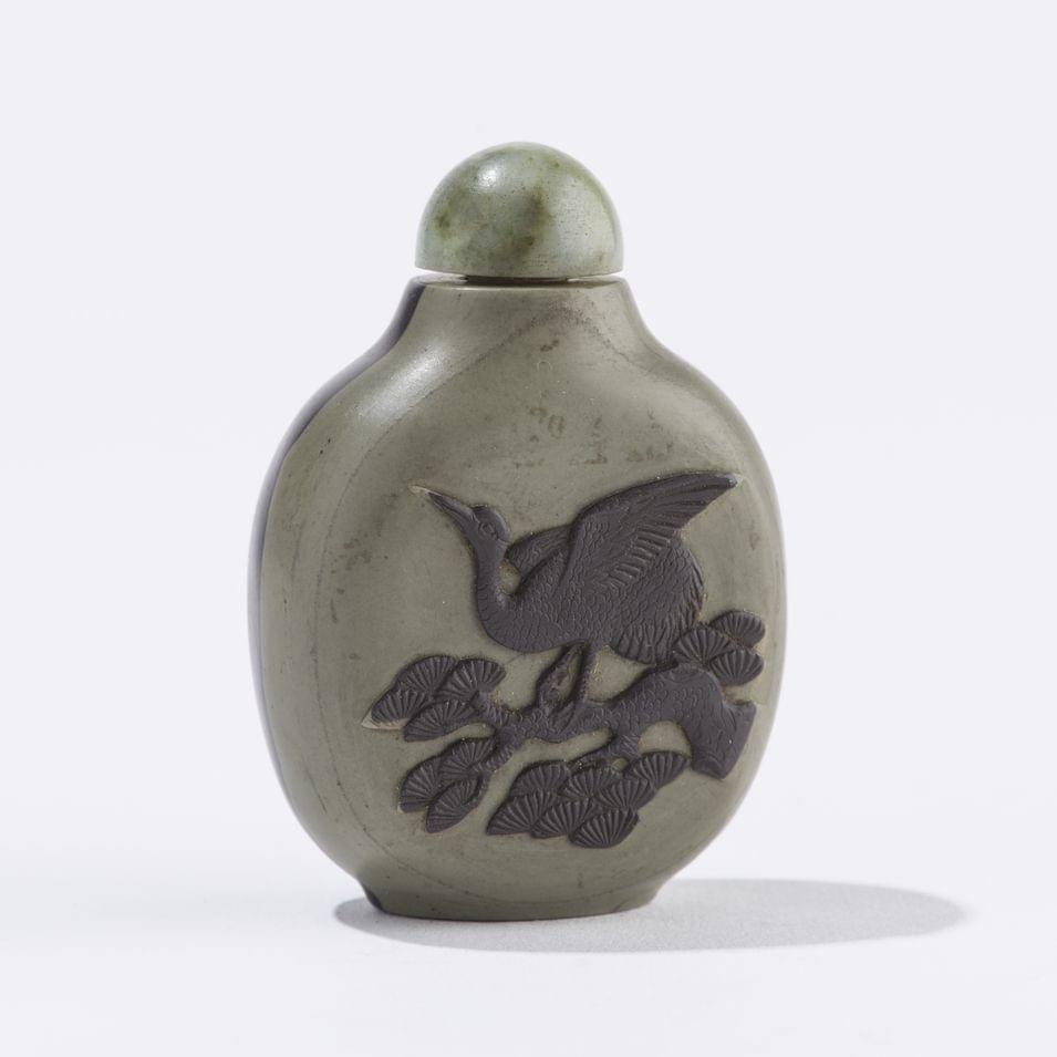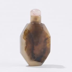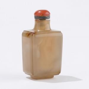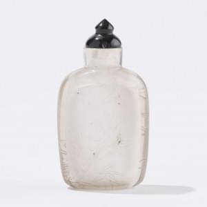 Le premier en agate zonée à quatre facettes rectangulaires sculptées et bouchon en cornaline, le second en cristal de roche à décor gravé de bambou et d'une corne d'abondance, bouchon en onyx, le troisième en agate à côtés facettés et bouchon en quartz rose, le dernier en pierre à savon à décor en camé d'une cigogne branchée, Chine, H de 6 à 7,5 cm