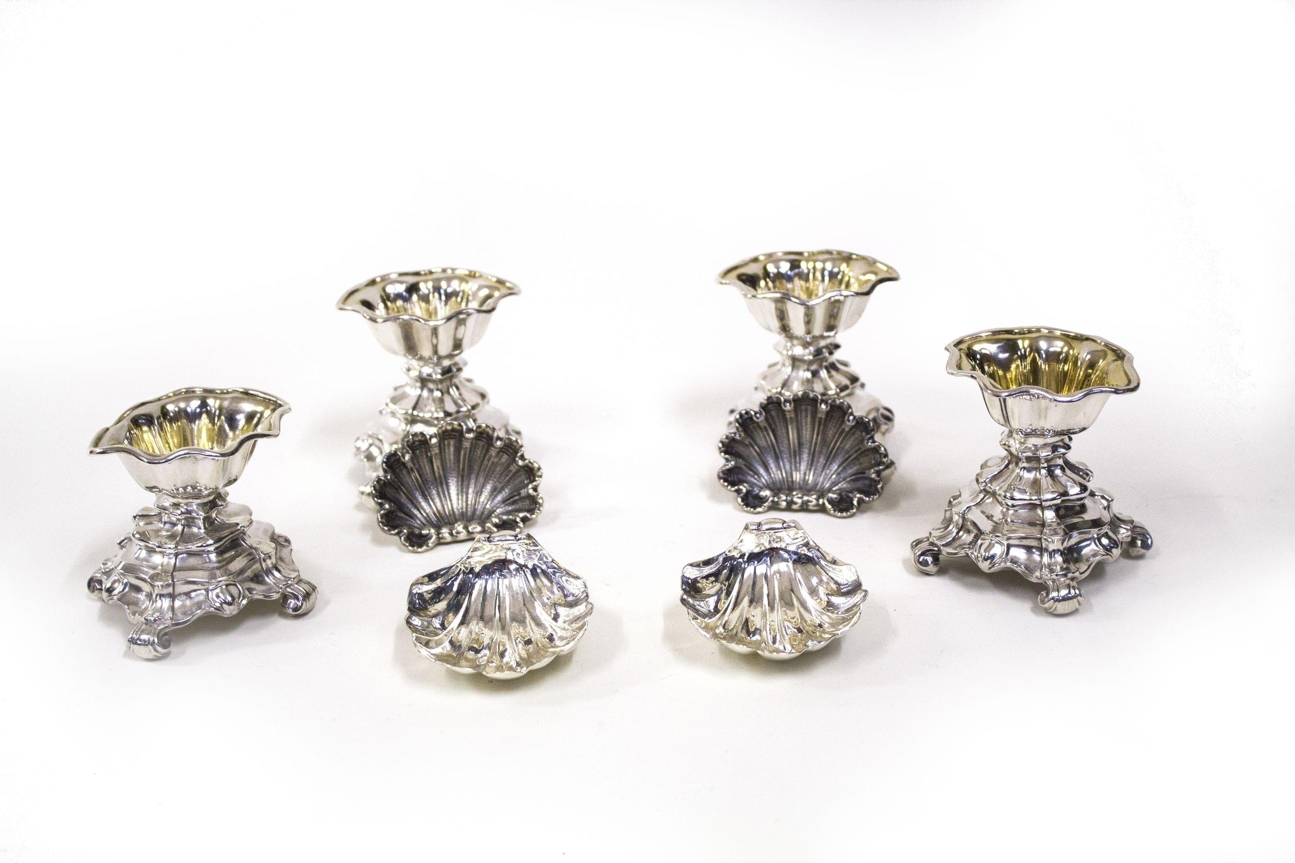 3513. Suite de quatre salerons sur pied et deux paires de coquilles