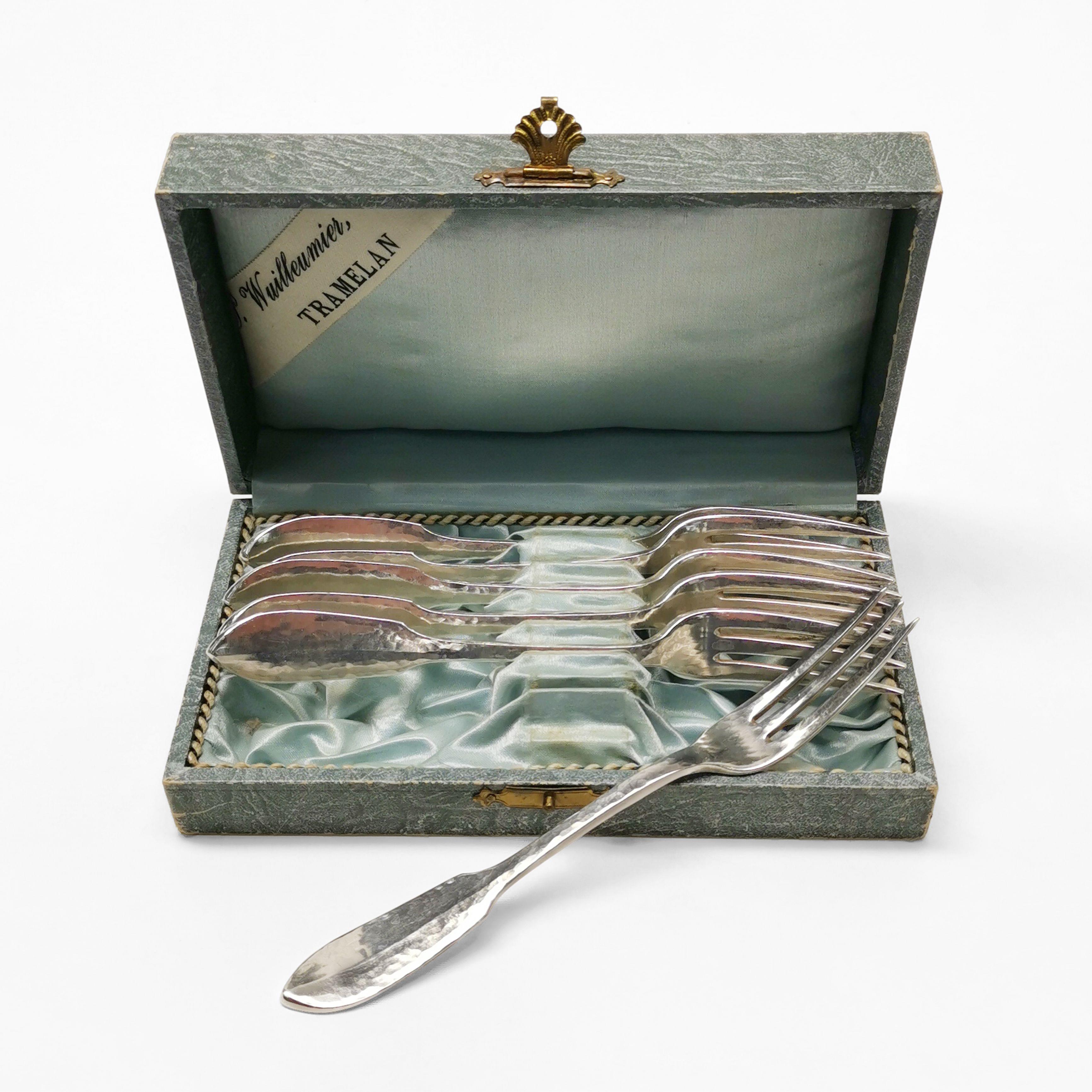 3867. Suite de six fourchettes à pâtisserie martelées
