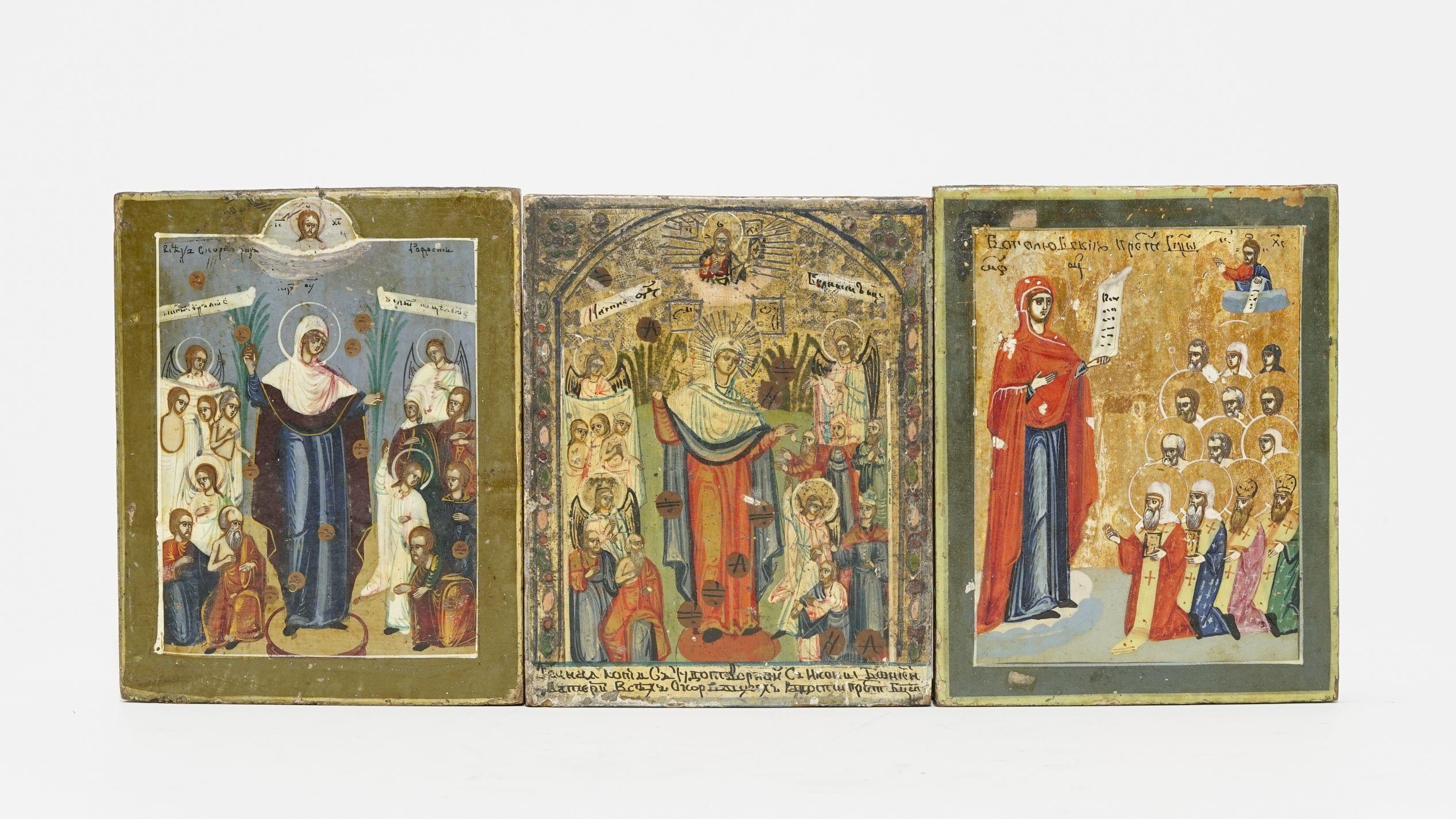Bois sculpté, tissu et éléments en laiton, H de 130 à 140 cm