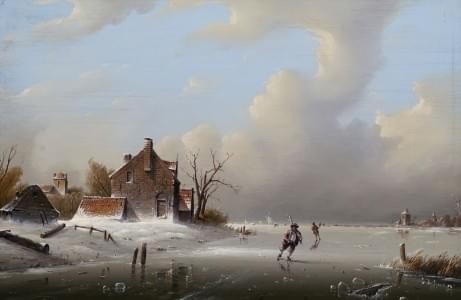 Paysage d'hiver animé, suite de trois huiles sur panneau, signée...