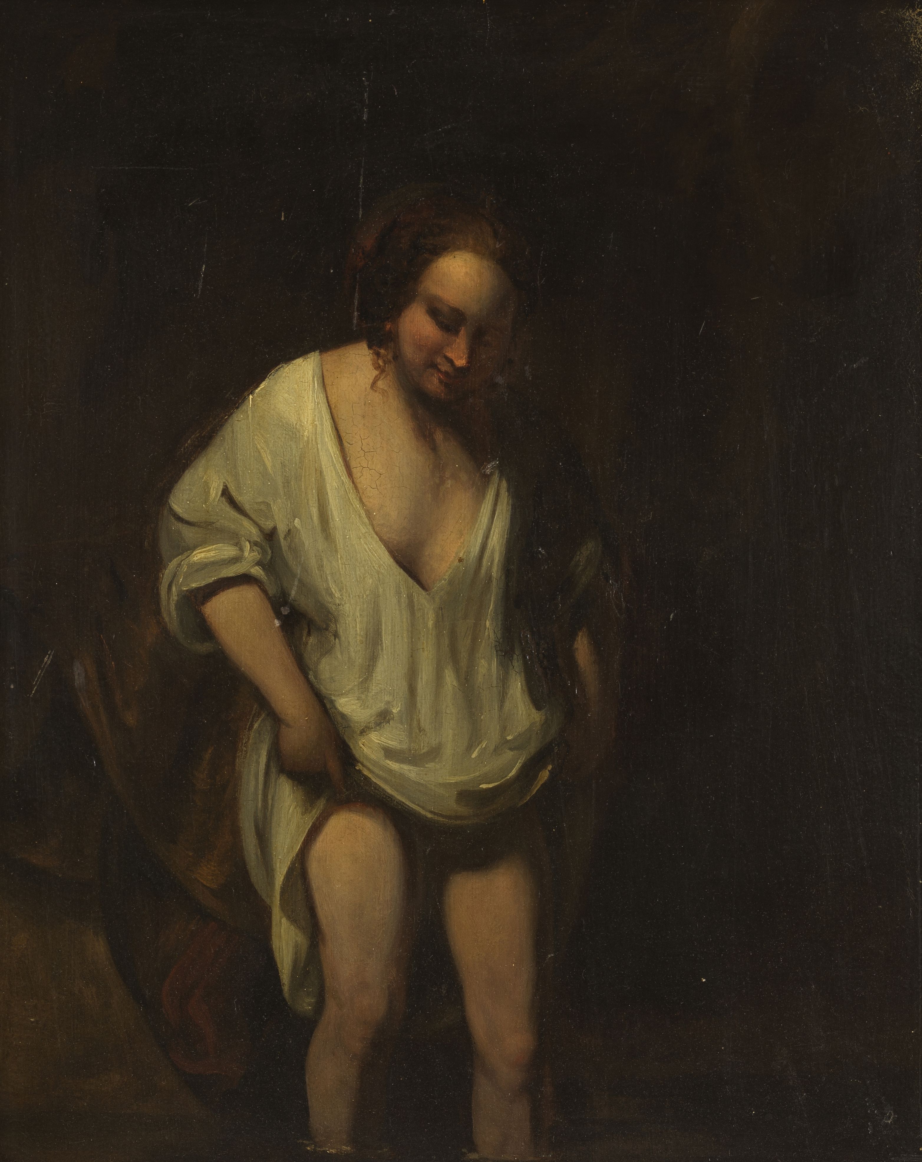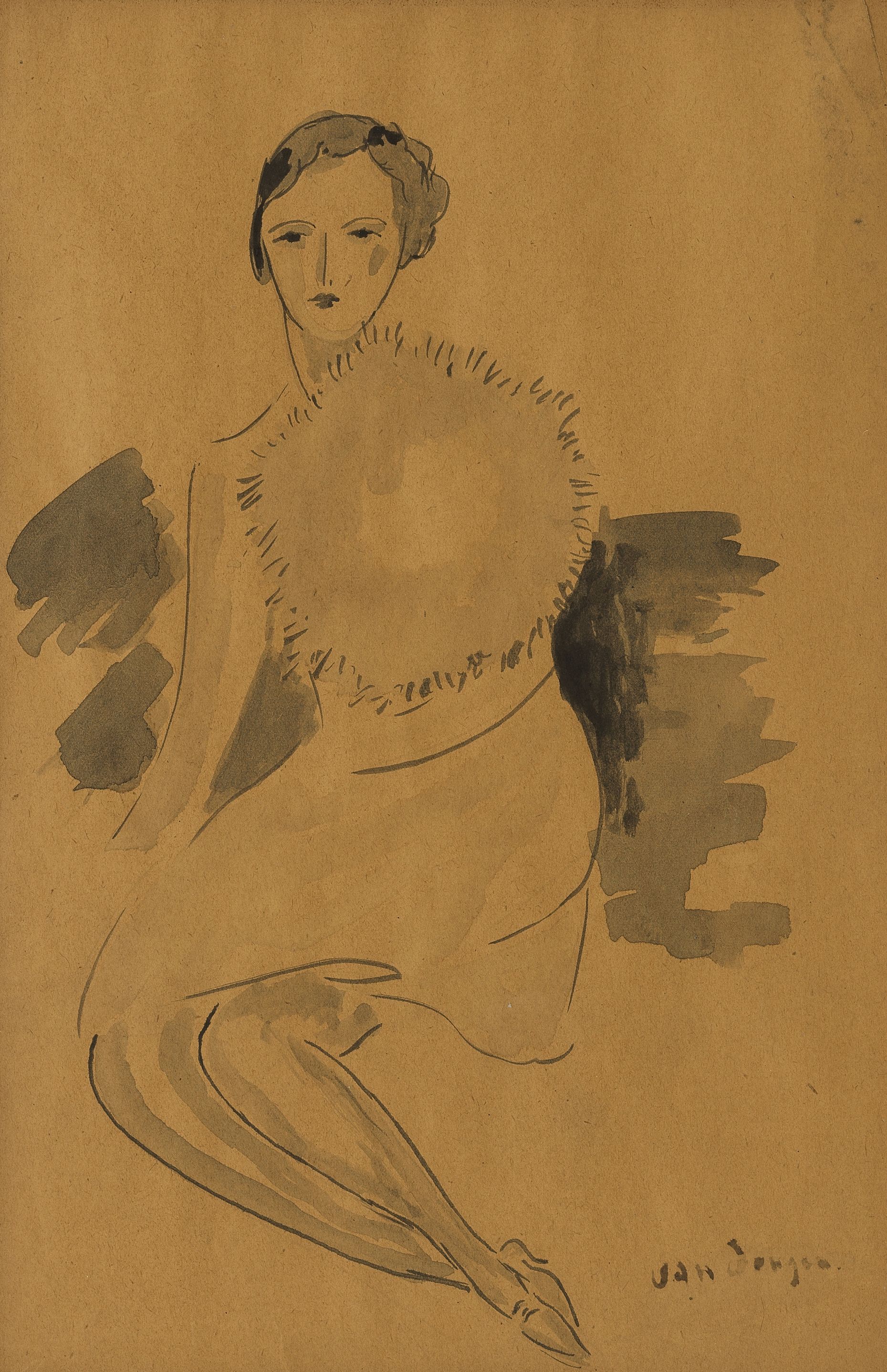 Femme à la fourrure, encre et lavis sur papier, signé, 31x21 cm