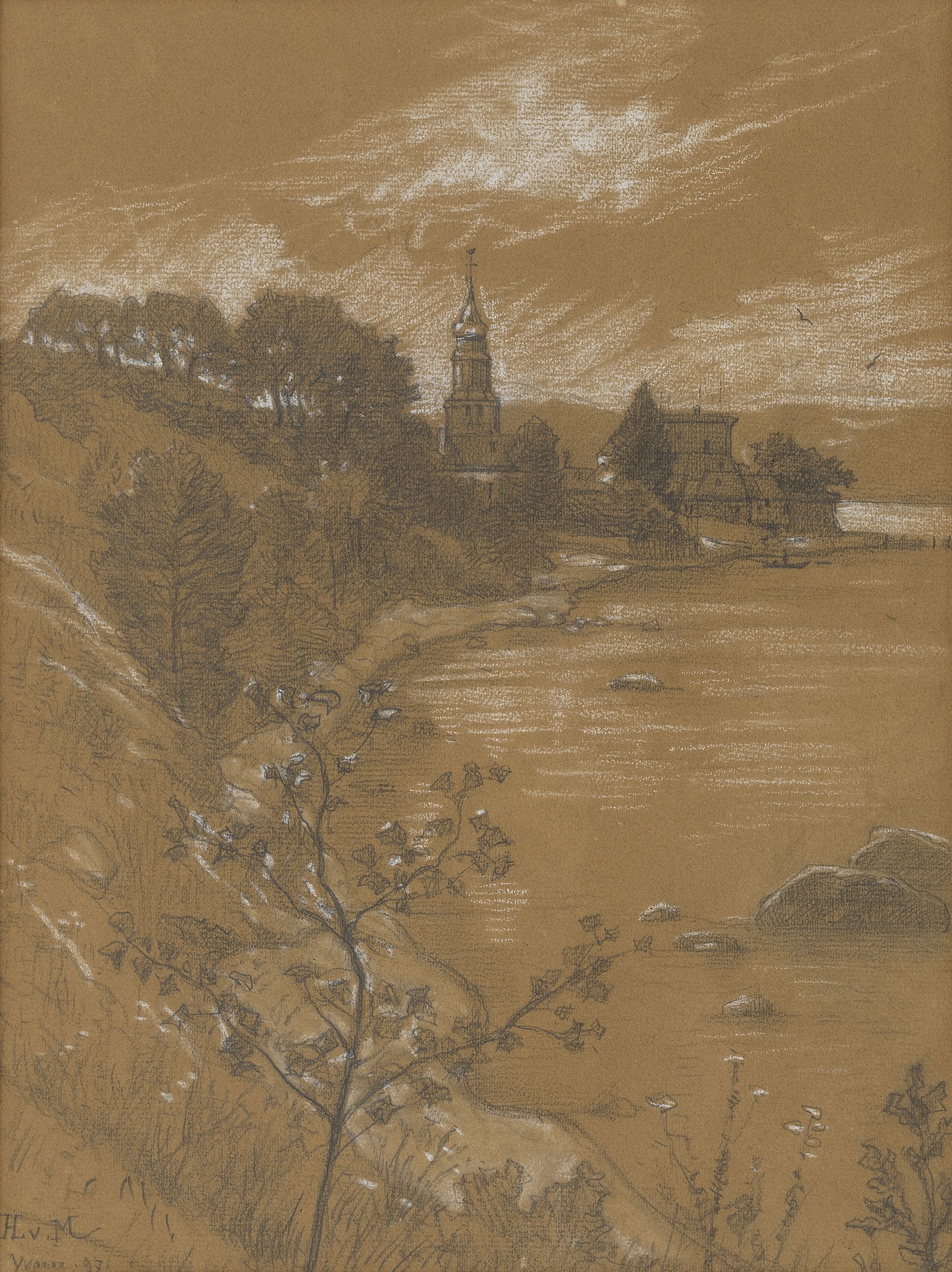 Vue d'Yvoire, crayon et gouache sur papier, monogrammé et daté 1...