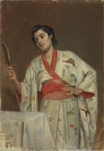 Jeune femme en kimono, huile sur toile, monogrammée, 35x24 cm