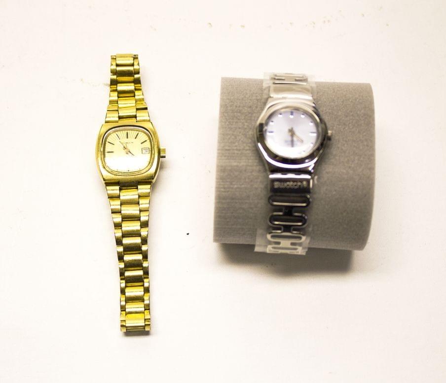 l'une en acier inoxydable, cadran et index bleu, D 18 mm, l'autre en métal doré, cadran, aiguilles et index bâton dorés, date à guichet à 3h, 20x20 mm