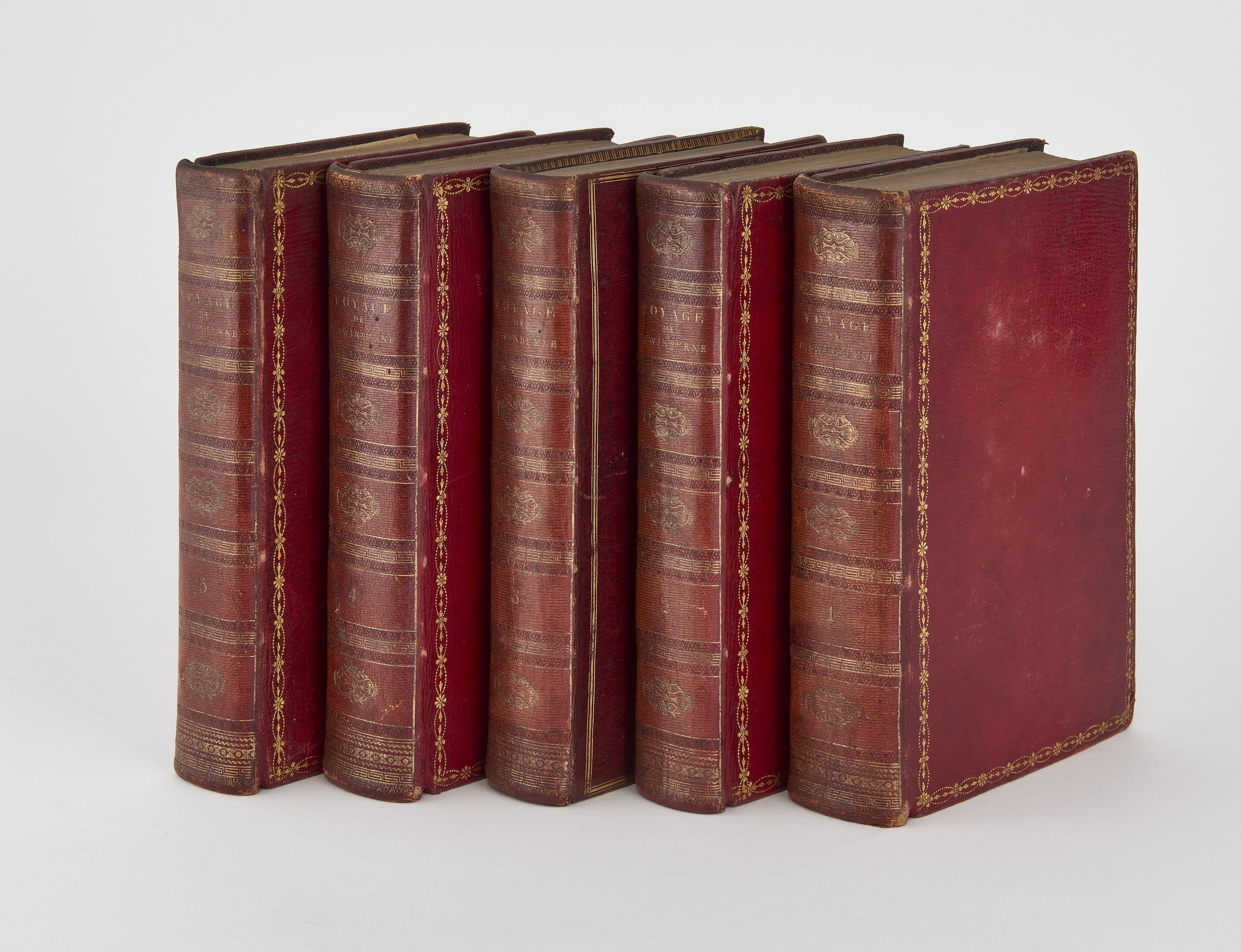 5 vol. in 8°, basane maroquinée rouge ornée de l'époque. Première ed française complète du 5e vol. contenant le Voyage en Sicile de Vivant Denon et le voyage de Bayonne à Marseille de Swinburne (rousseurs)