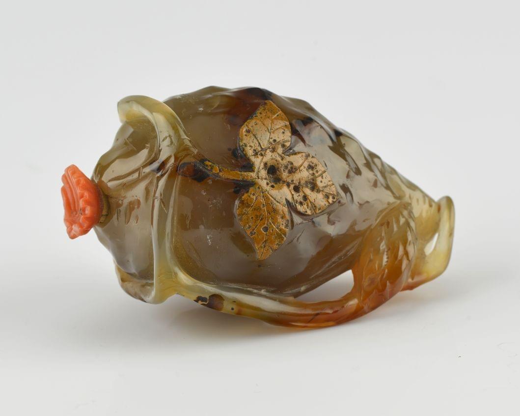 Agate, grise à inclusions caramel et noire en forme de fruit sculpté de branches en relief, L 8 cm