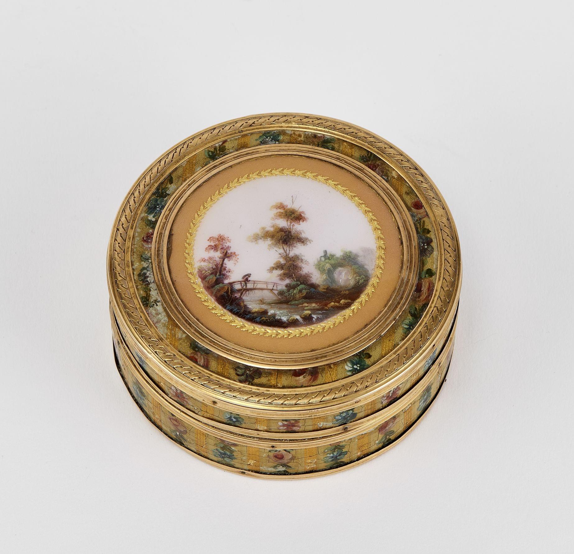 415. Tabatière ronde ornée d'un paysage animé en miniature, monture à motif d'entrelacs sur fond de cannelures et de roses