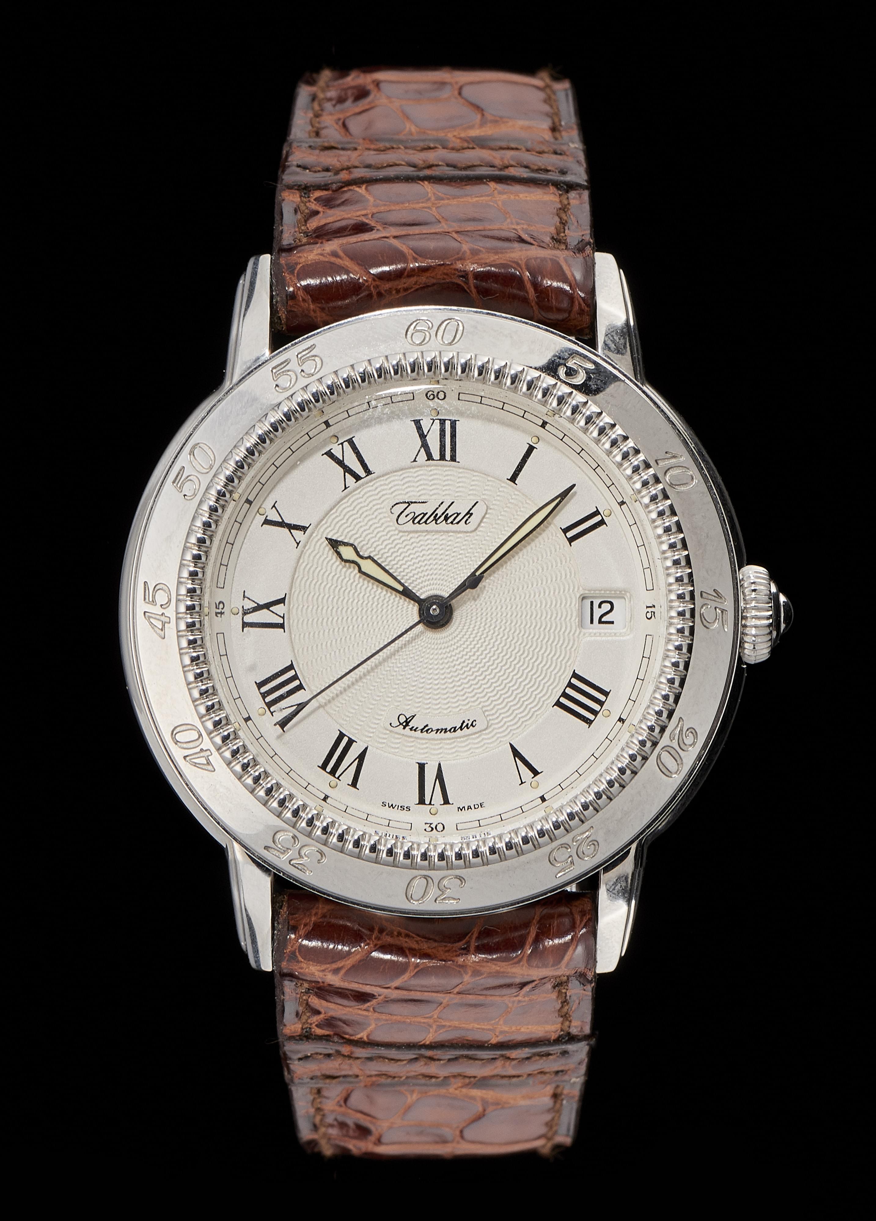 Cadran crème, lunette à chiffres arabes, chiffres romains noirs, date à guichet à 3h, acier, D 38 mm
