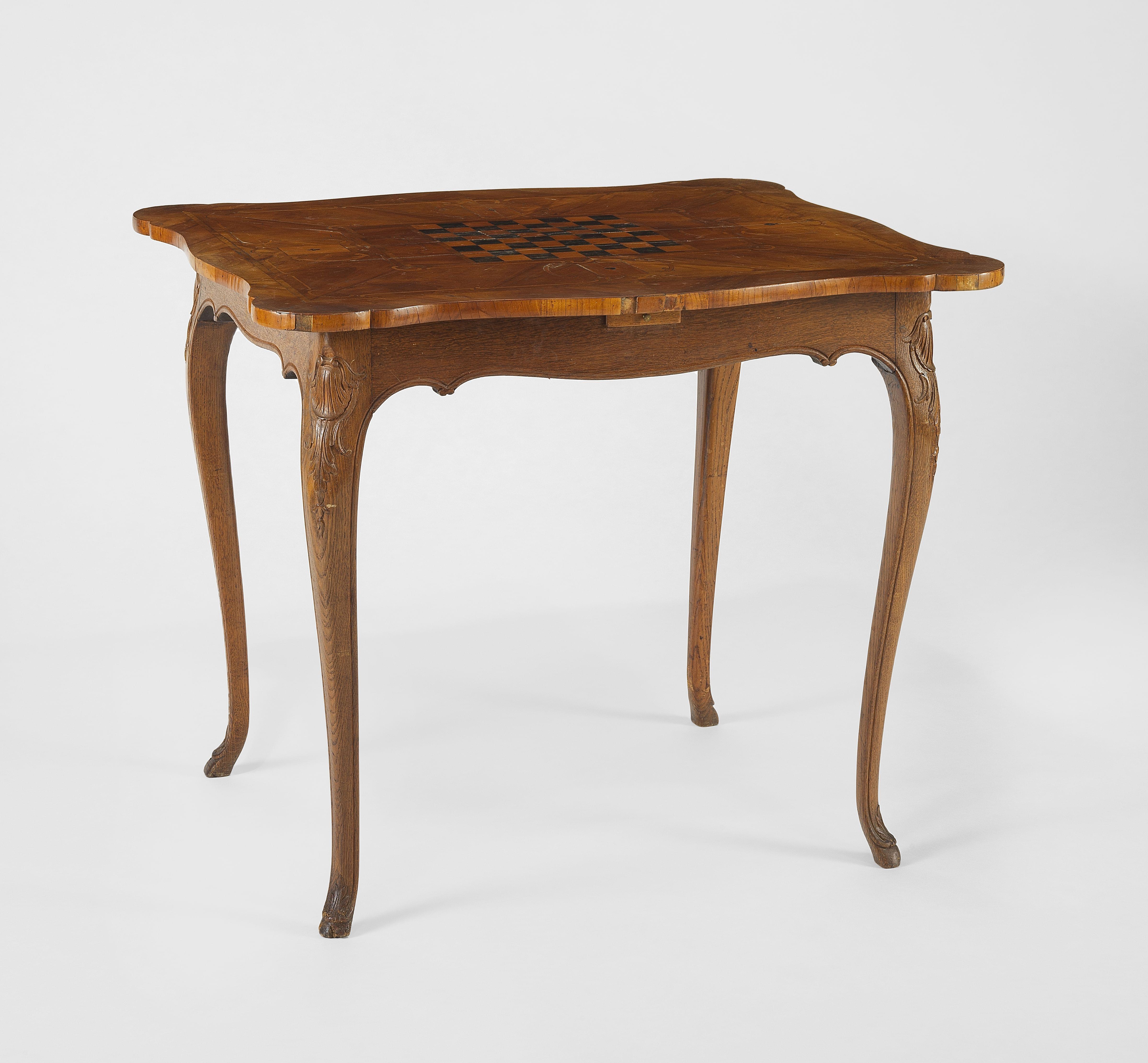 Plateau festonné marqueté d'un damier et de cartes à jouer en trompe-l'oeil, bois fruitier et chêne, 74x87x72 cm. Provenance Habsbourg: succession de l'archiduc Albert II d'Autrich-Teschen