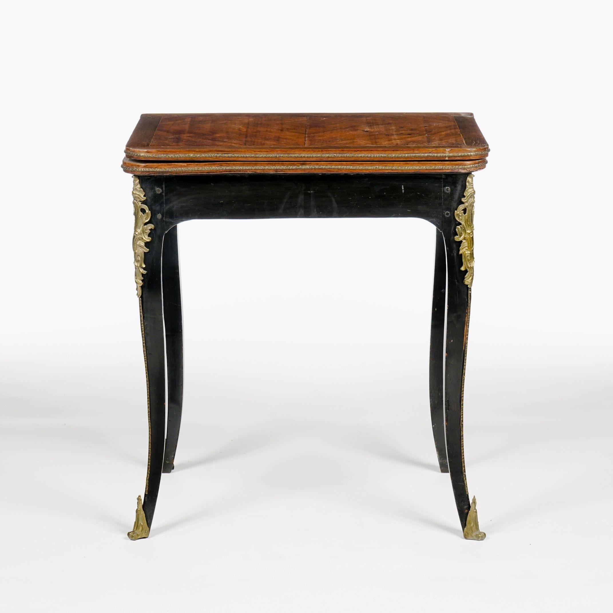 Marqueterie de bois de rose et violette, bois noirci, bronze doré, plateau à abattant, 71x65x44 cm. Collection B. de Saussure