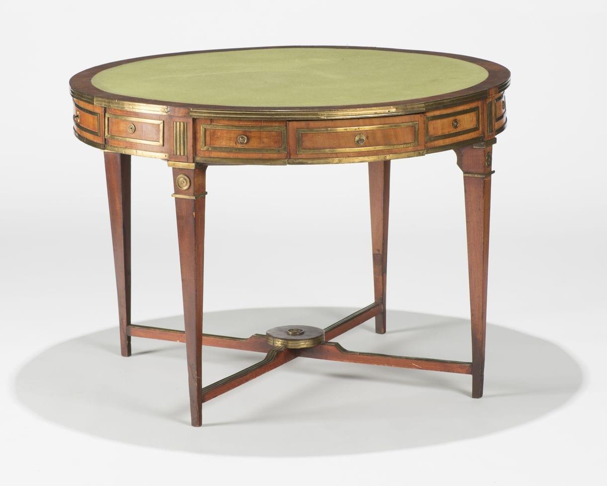 Quatre tiroirs et entretoise en X, acajou et larges moulures de laiton, feutre vert, 72x103 cm