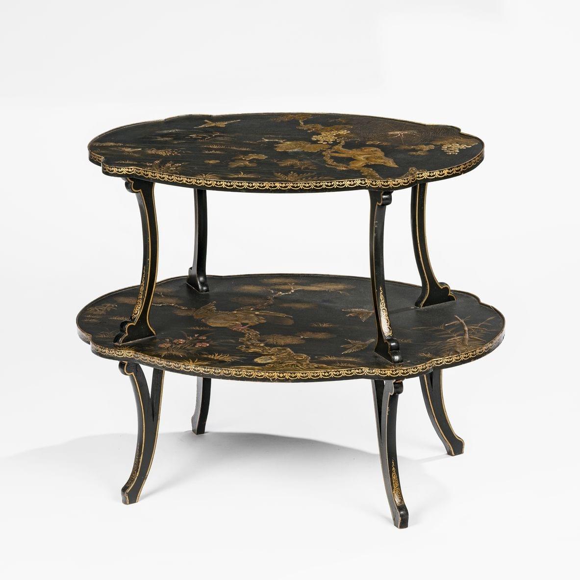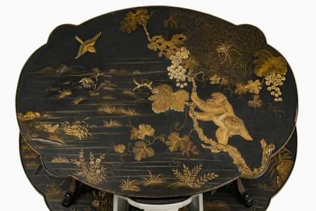 Deux plateaux, laque noir et or à décor de babouins, oiseaux, araignée et végétaux, 80x90x65 cm