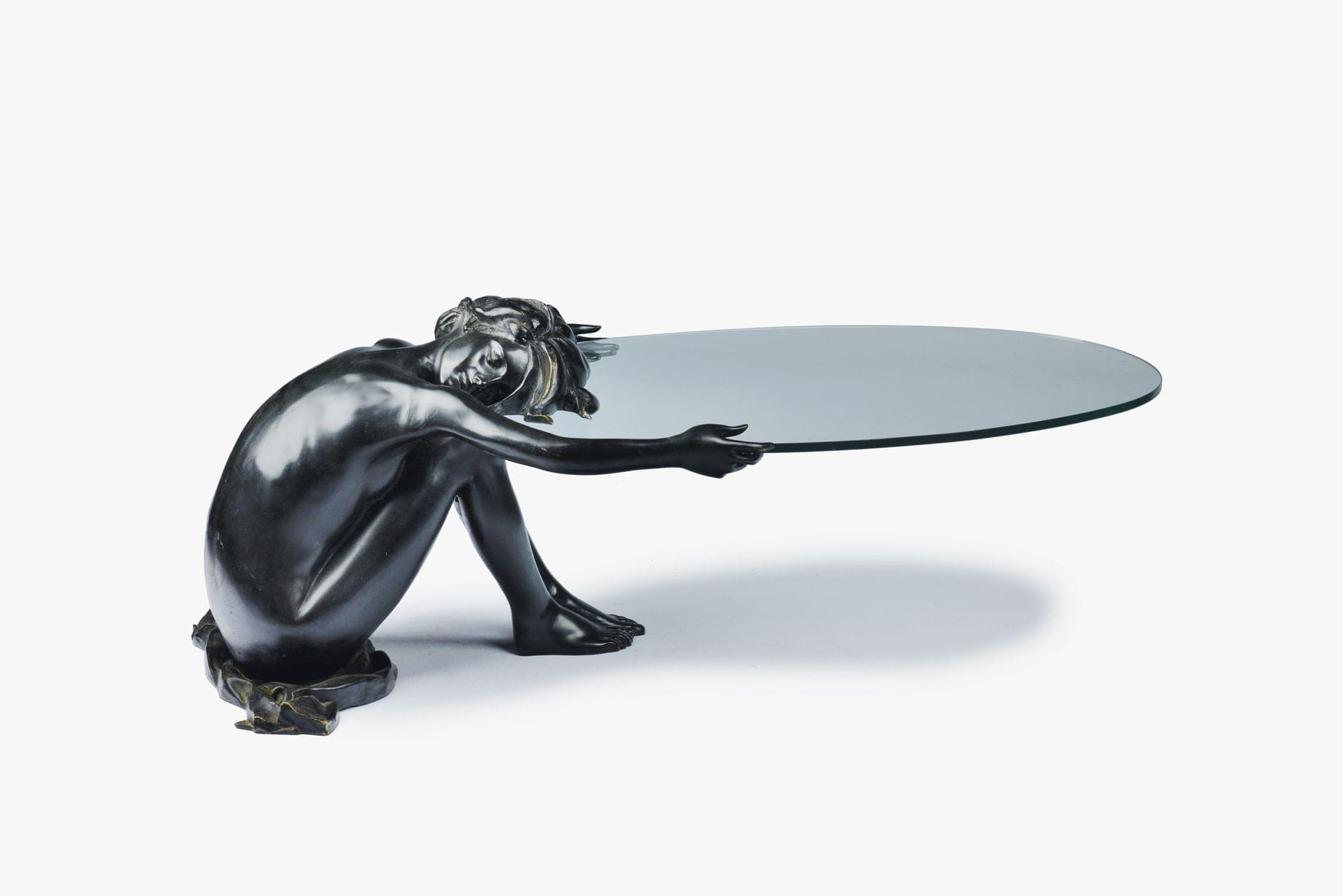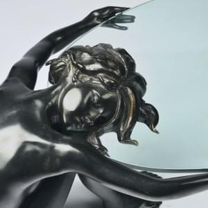 Plateau ovale soutenu par une femme nue, bronze à patine brune, verre, circa 1980, 55x150x75 cm
