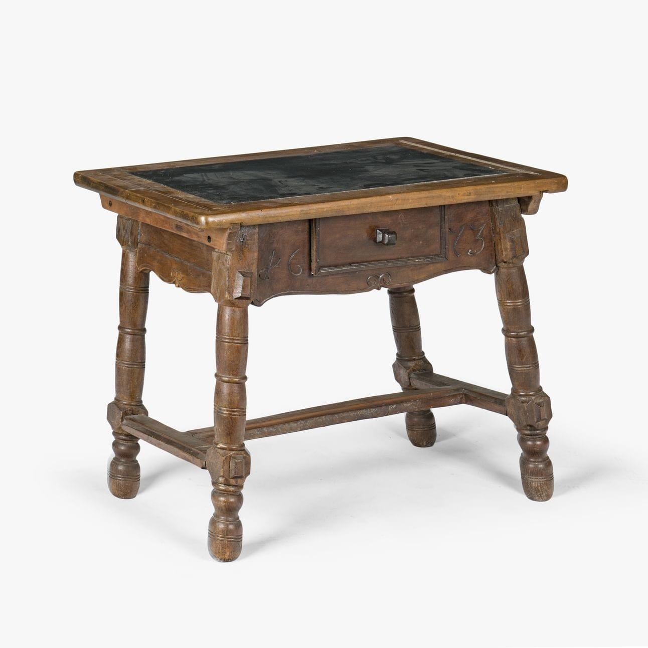 Bois fruitier et ardoise, 75x99x59 cm. Provenance: Château fribourgeois