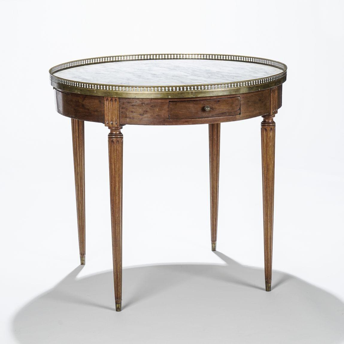 Deux tiroirs, deux tablettes, acajou, marbre blanc, laiton, H 75 cm, D 81 cm