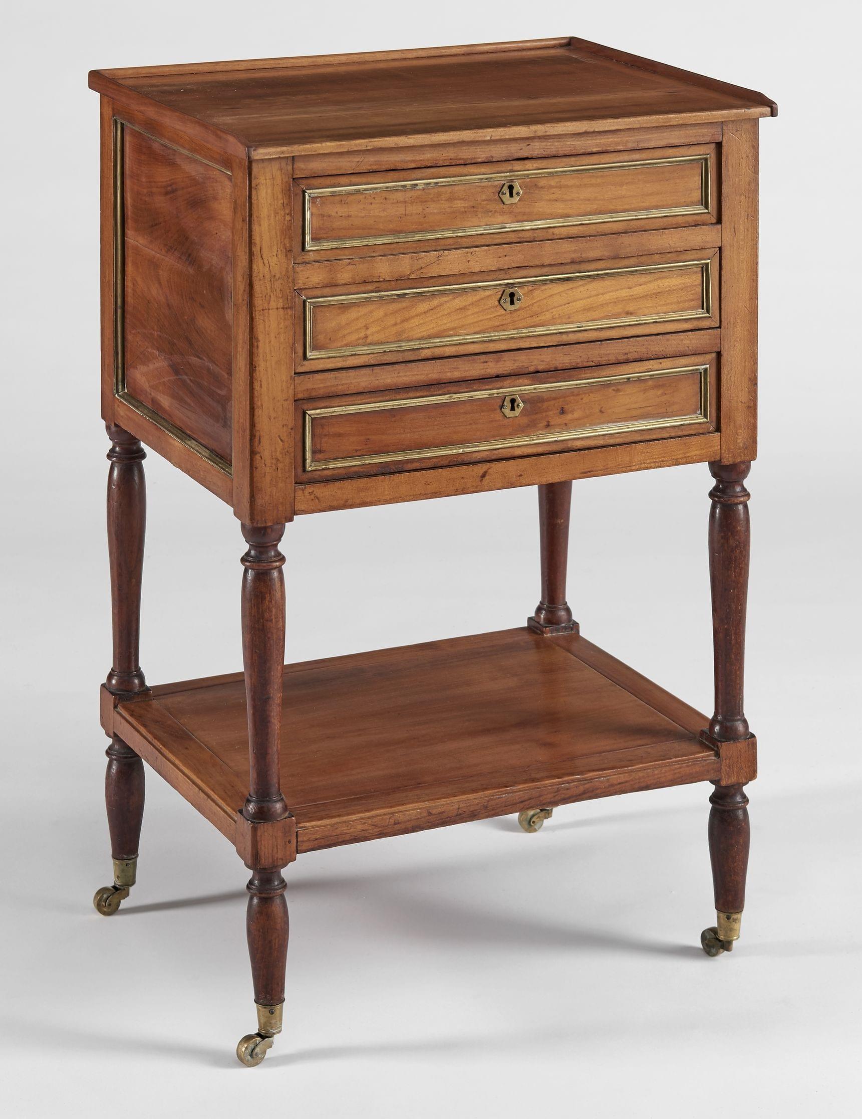 Deux tiroirs, pieds sur roulettes, acajou blond et laiton, 55x48x38 cm