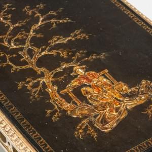 Bois laqué et doré, pieds gaine, plateau de laque à décor de personnages sur fond or, 73,5x65x40cm