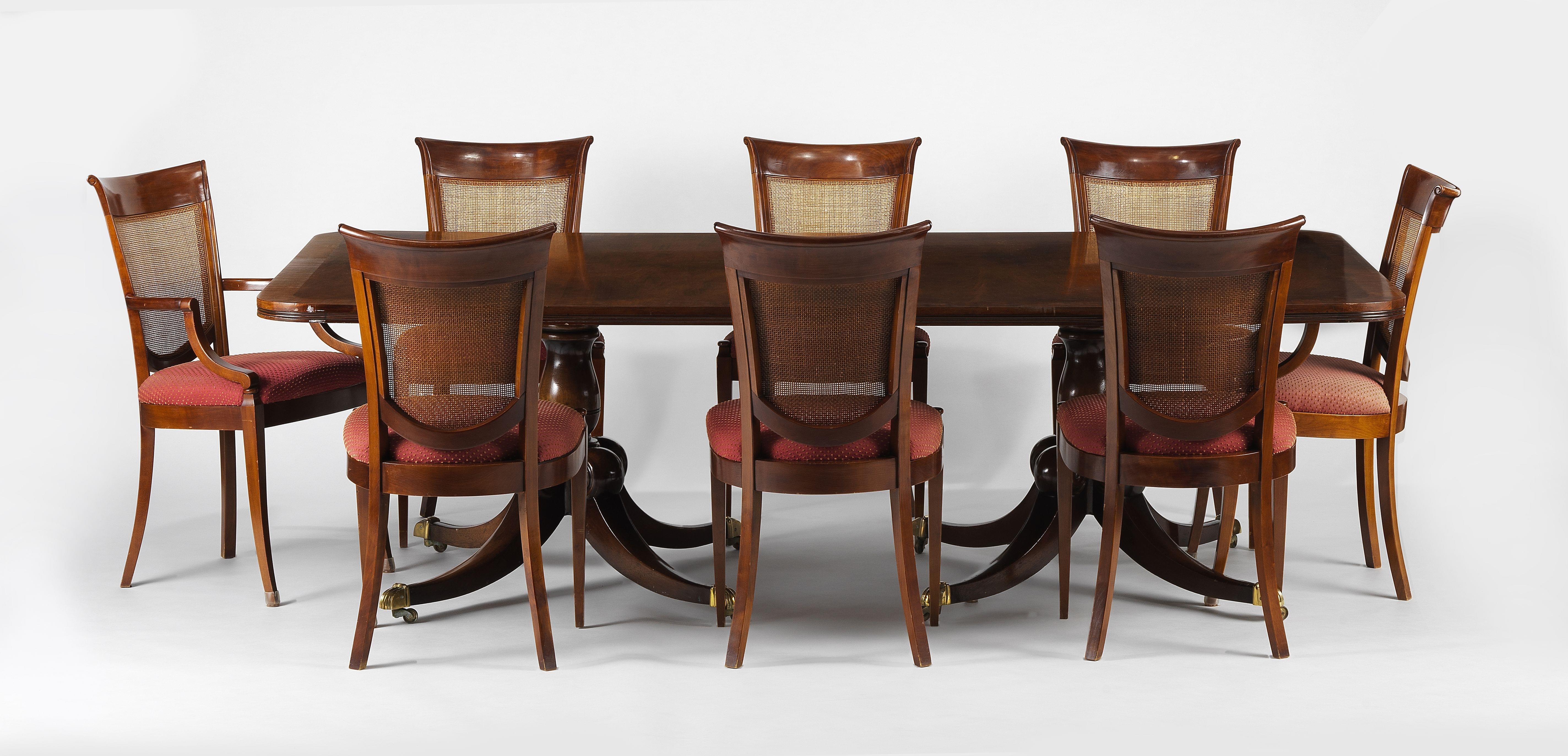 Acajou, double piètement à quatre pieds terminés en laiton, 73x244x137 + 2 allonges de 53 cm. On joint 12 chaises