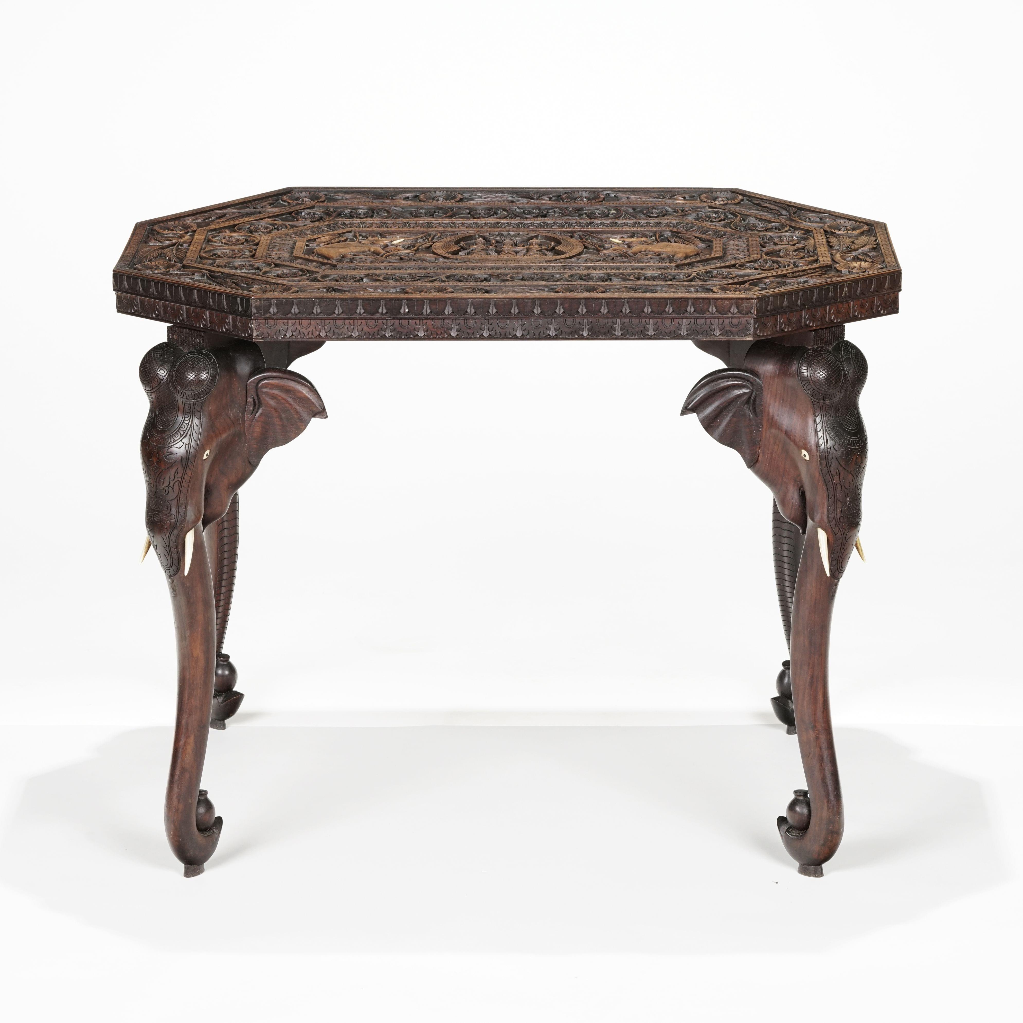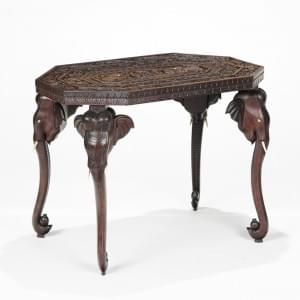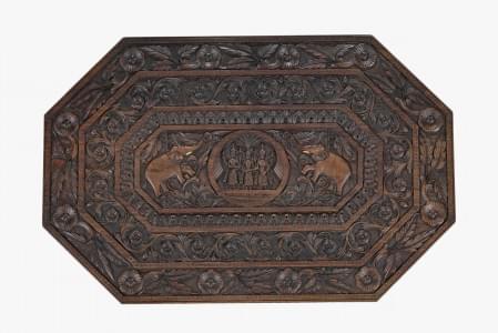 Bois sculpté à décor de trois personnages entourés de deux éléphants et de rinceaux et fleurs, pieds en forme de tête d'éléphant, 70x92x60 cm