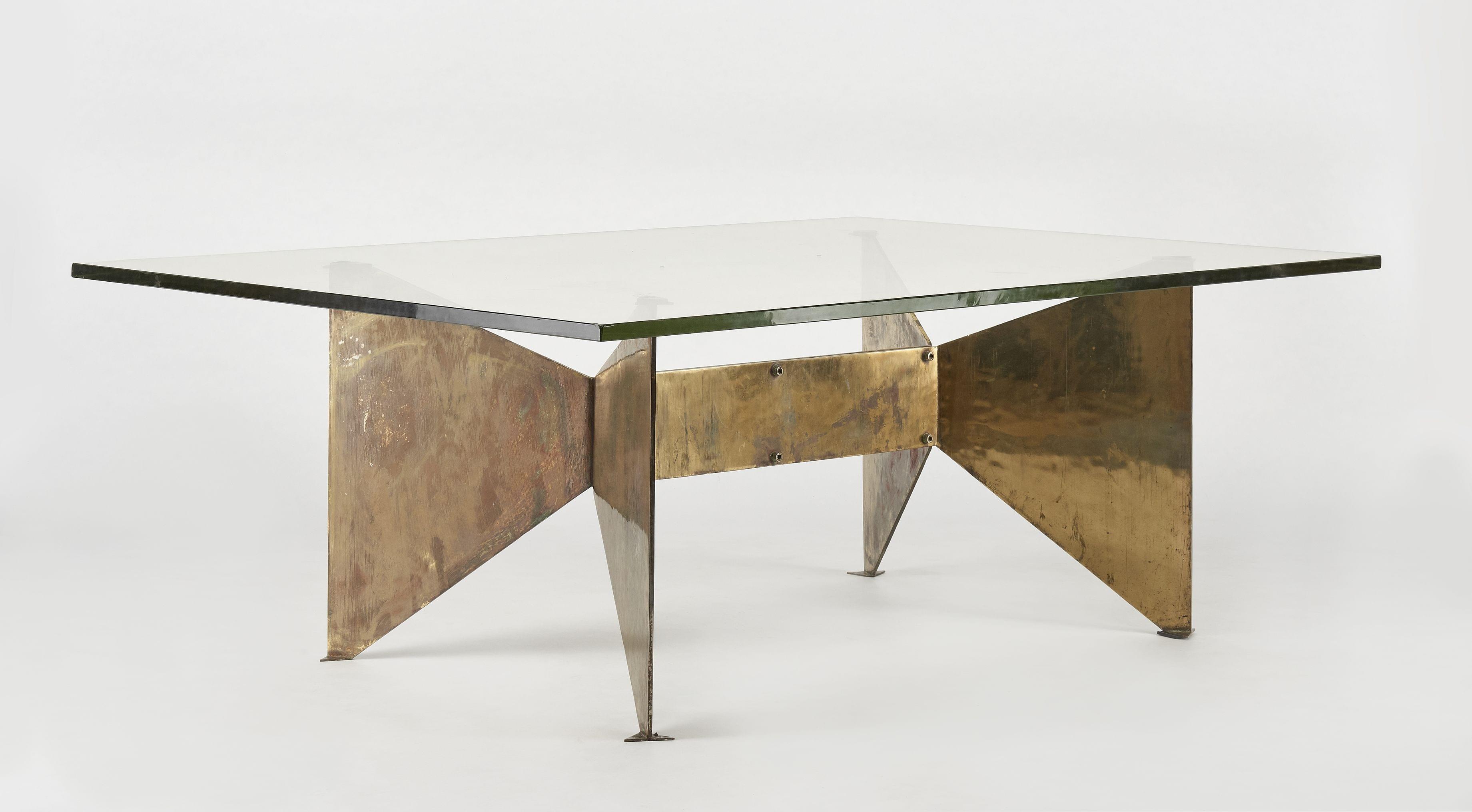 Verre et piètement en métal à patine dorée, 75x208x140 cm. Figure majeure de la construction des grands ensembles de l’après-guerre à Genève, Addor est notamment l’auteur des immeubles du parc de Budé et du Lignon.