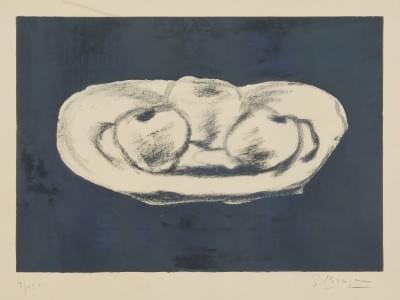 Pommes sur fond noir, lithographie originale en noir, 1954, sign...
