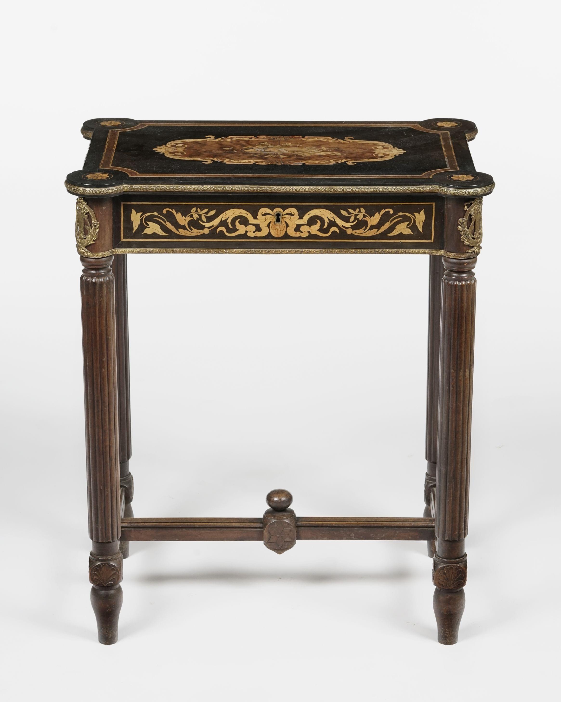 Marqueterie de bois fruitier à décor de fleurs sur fond de poirier noirci, entretoise, 74x62x43 cm