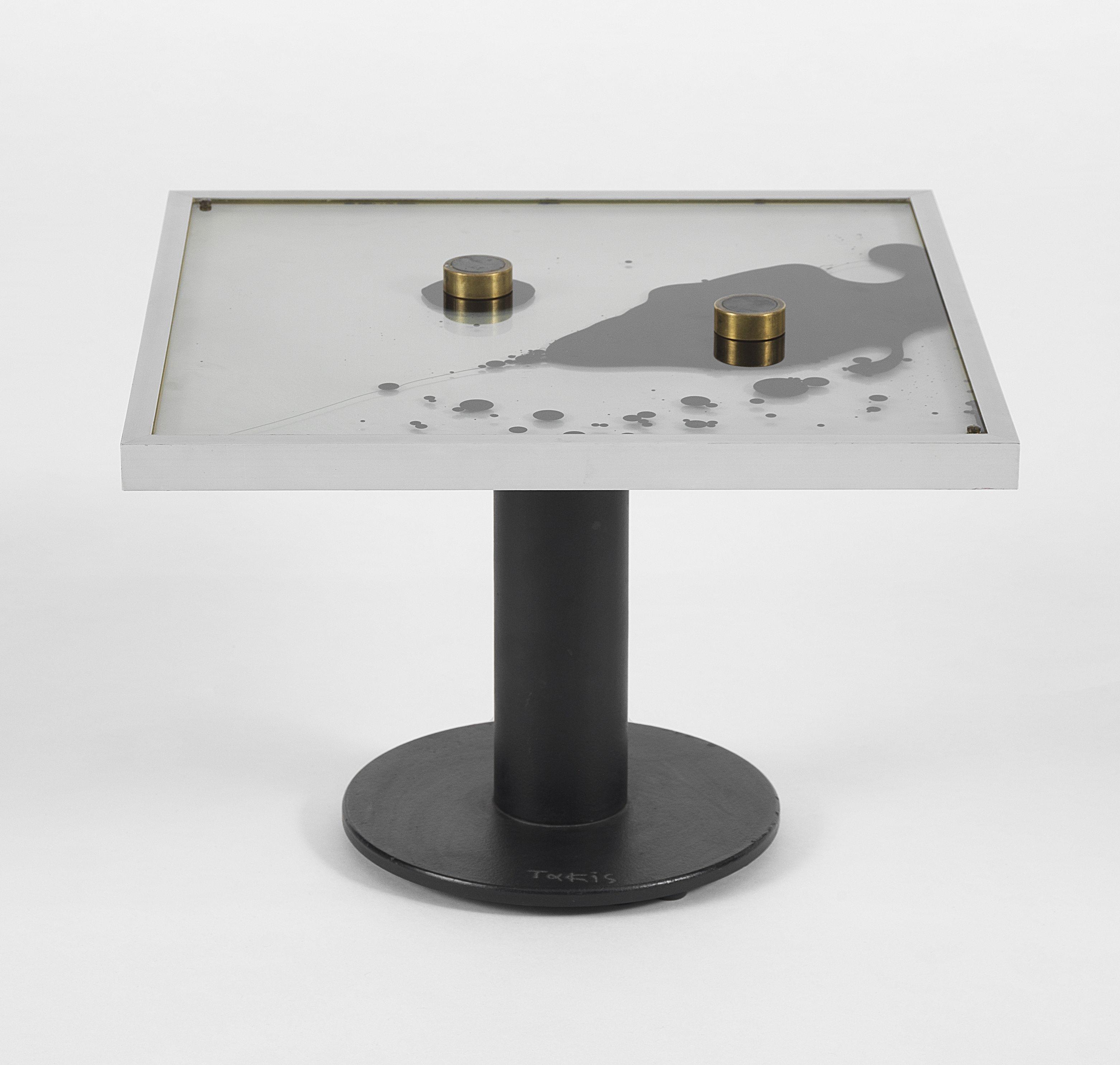Table en verre et acier, fluide magnétique et une paire d'aimants, signée et datée 1978, numérotée 4/9 sous le plateau, 31x 45,5x 45,5 cm. Provenance: collection Marisa Perret-Rezzonico