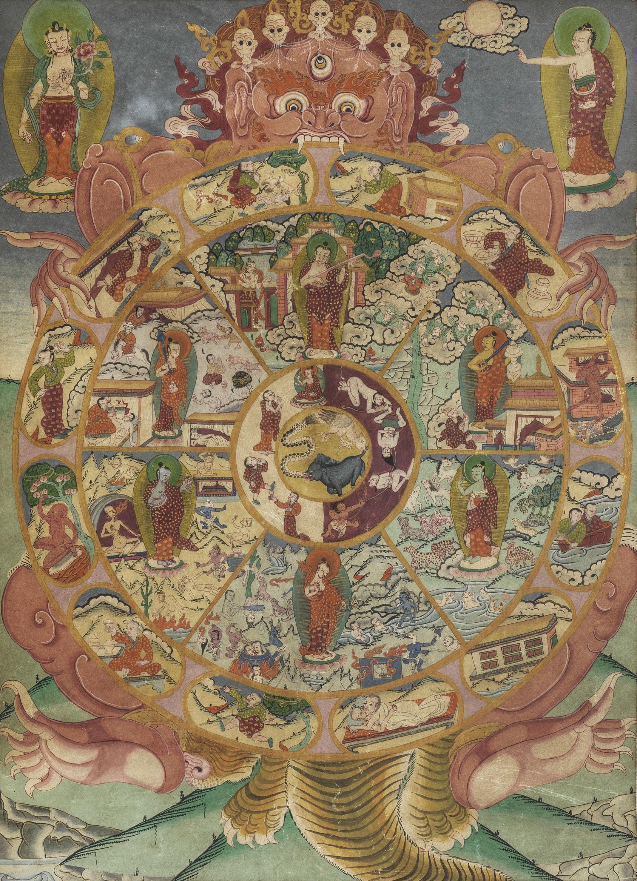 Divinité tenant une roue illustrée de paysages, pigments sur toile, 67x49 cm