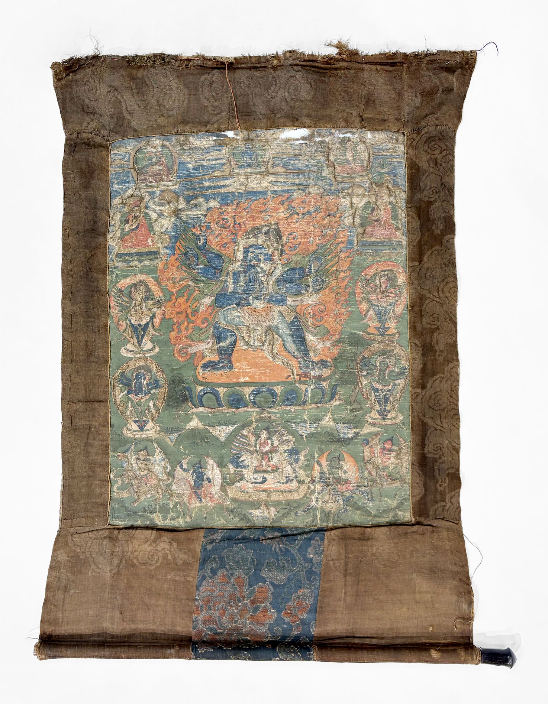 Figurant une divinité et ses acolytes, pigments sur soie, 52x40 cm