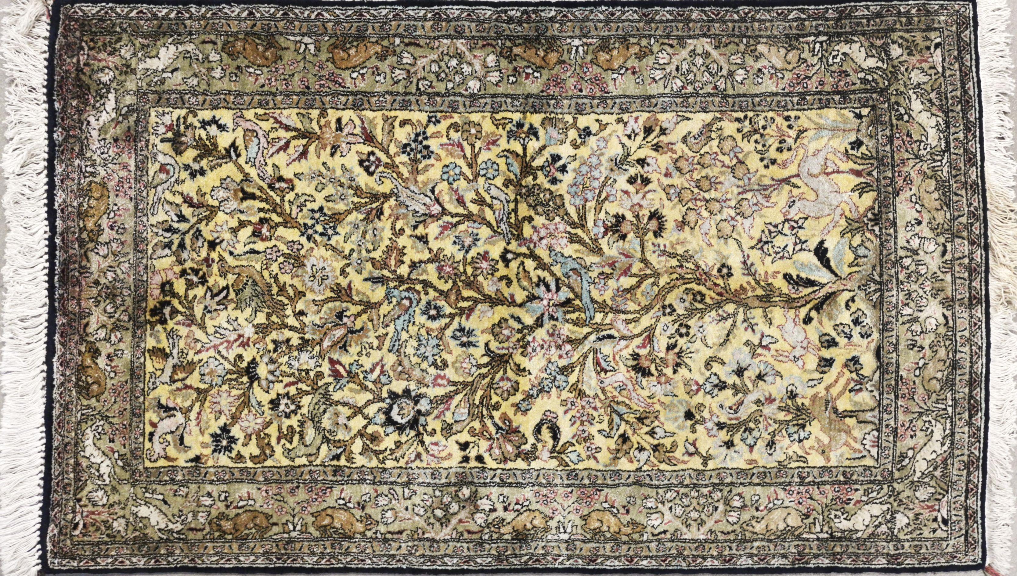Soie à décor d'un arbre et d'oiseaux branchés sur fond jaune, 135x80 cm