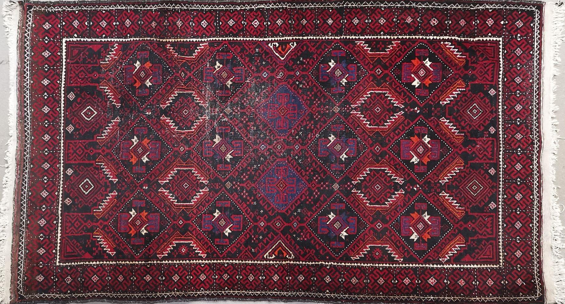 Laine à décor géométrique sur fond rouge,100x112 cm
