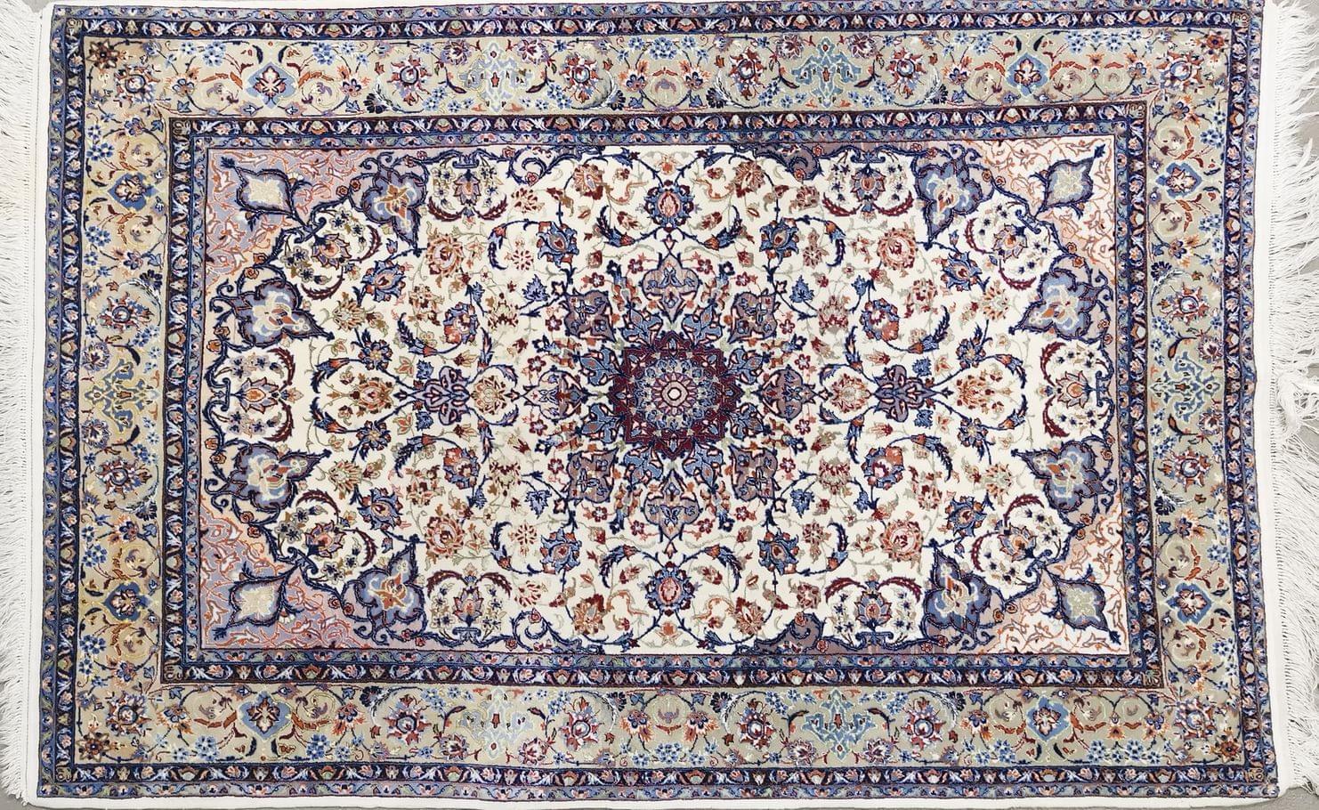 Laine à décor d'un médaillon central de rinceaux sur fond beige,163x110 cm