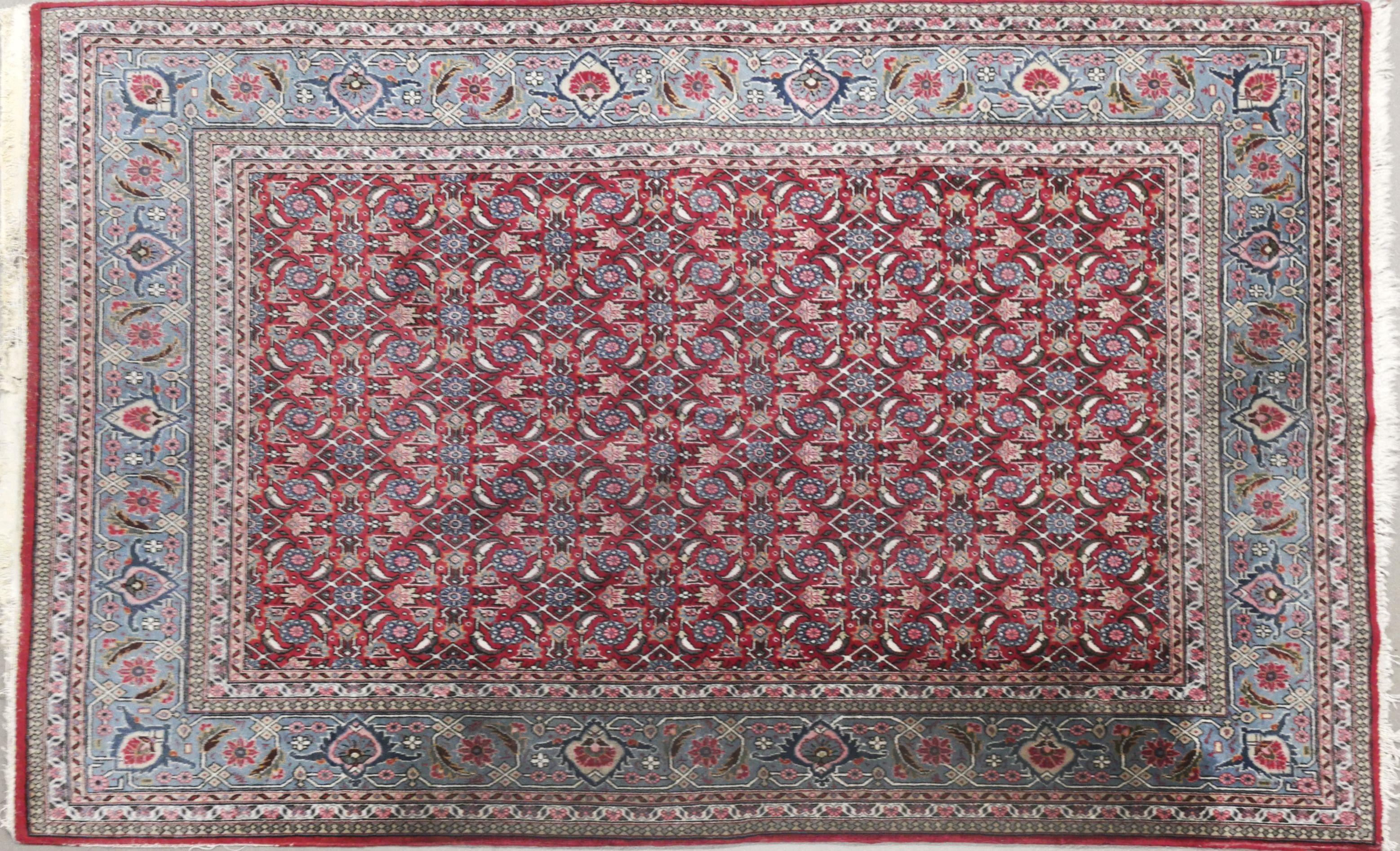 Laine à décor sur fond rouge, dans un cadre bleu, 209x144 cm