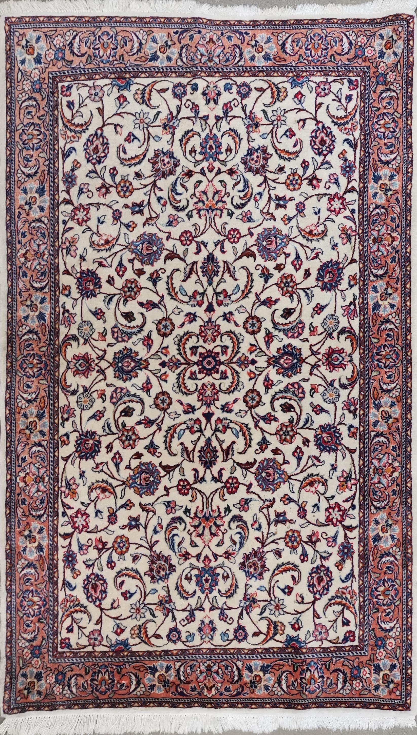 A décor de rinceaux sur fond crème, bordure sur fond rose, 163x106 cm