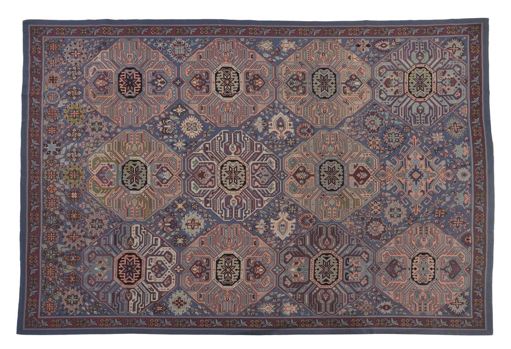 A motif de médaillons géométriques sur fond bleu-gris, laine, 275x230 cm