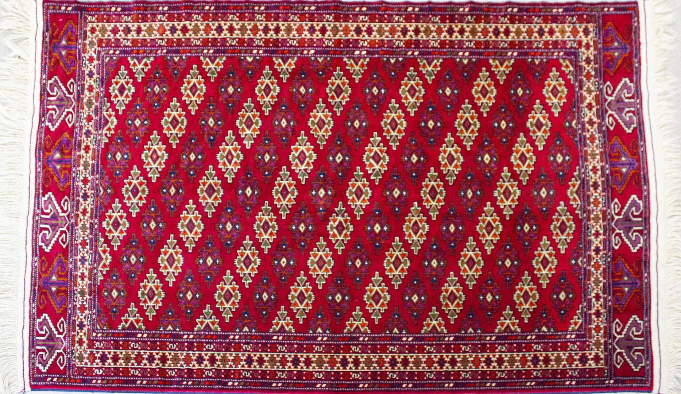 Laine à motifs géométriques sur fond rouge brique, 190x117 cm