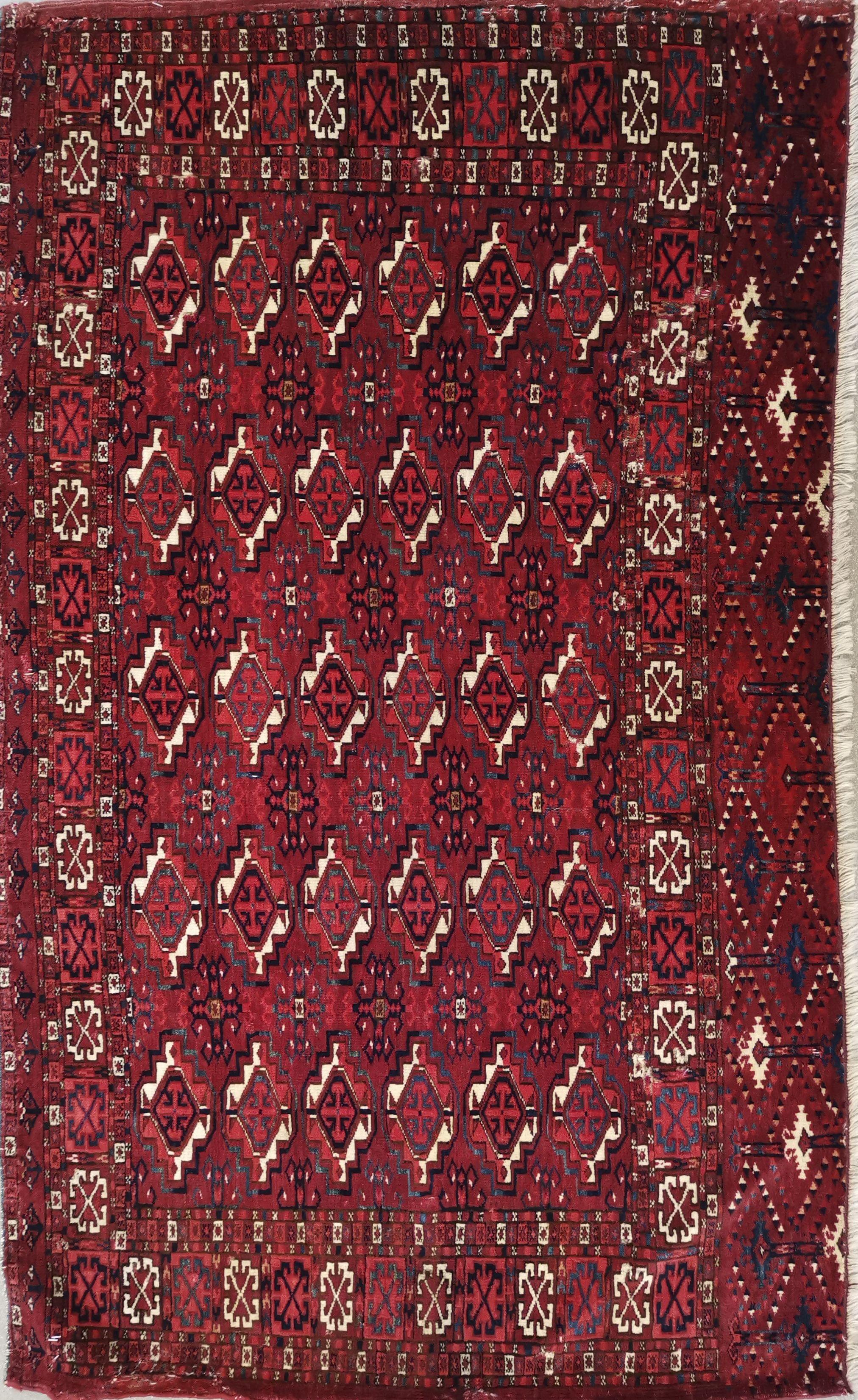 Laine à motif de semis de médaillons géométriques sur fond rouge brique, 130x80 cm.