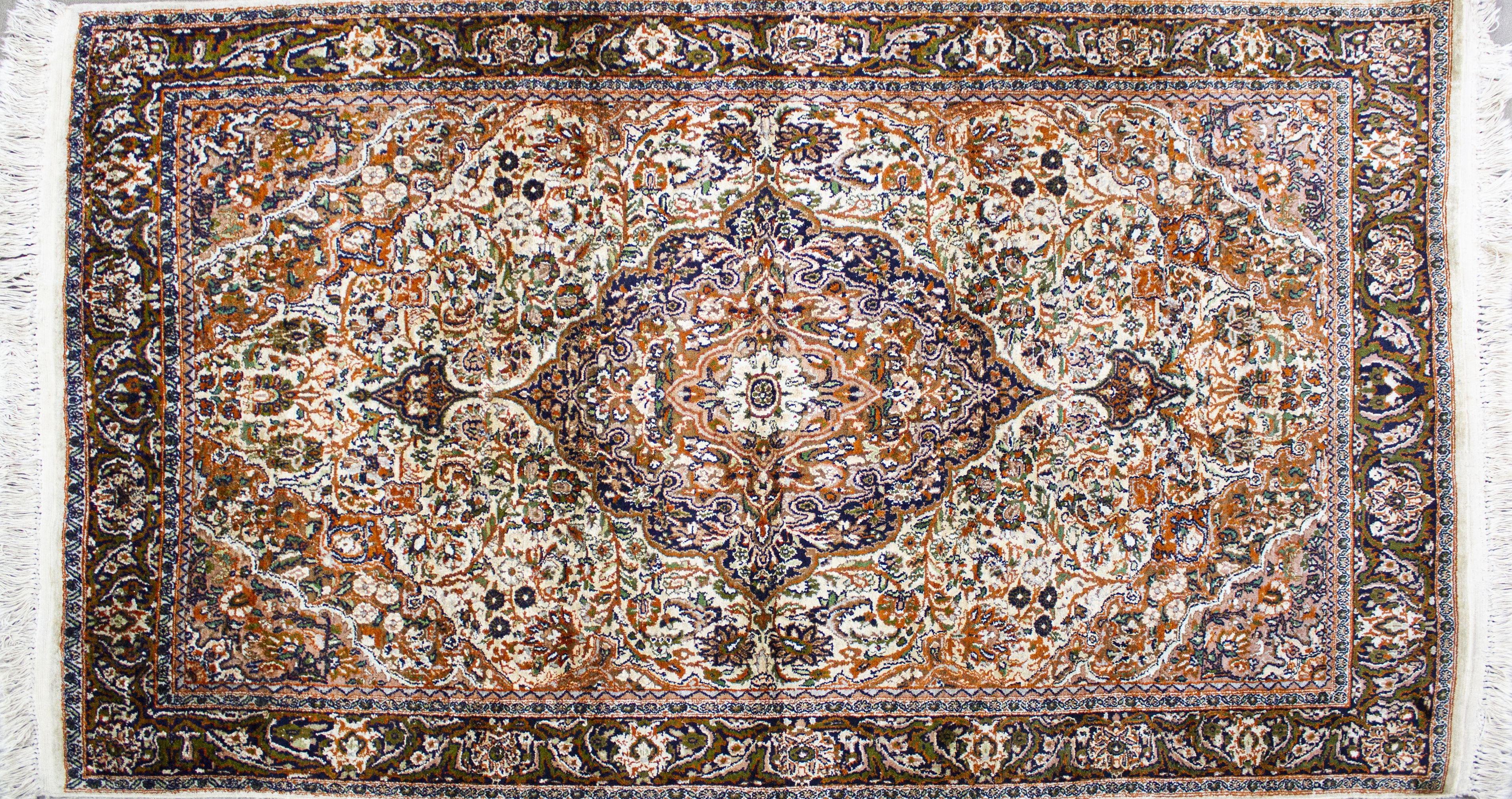 Soie à médaillon central à rosace marine et crème sur champ ivoire, écoinçons vieil or, bordure marine entre galons marine et crème, 180x121 cm