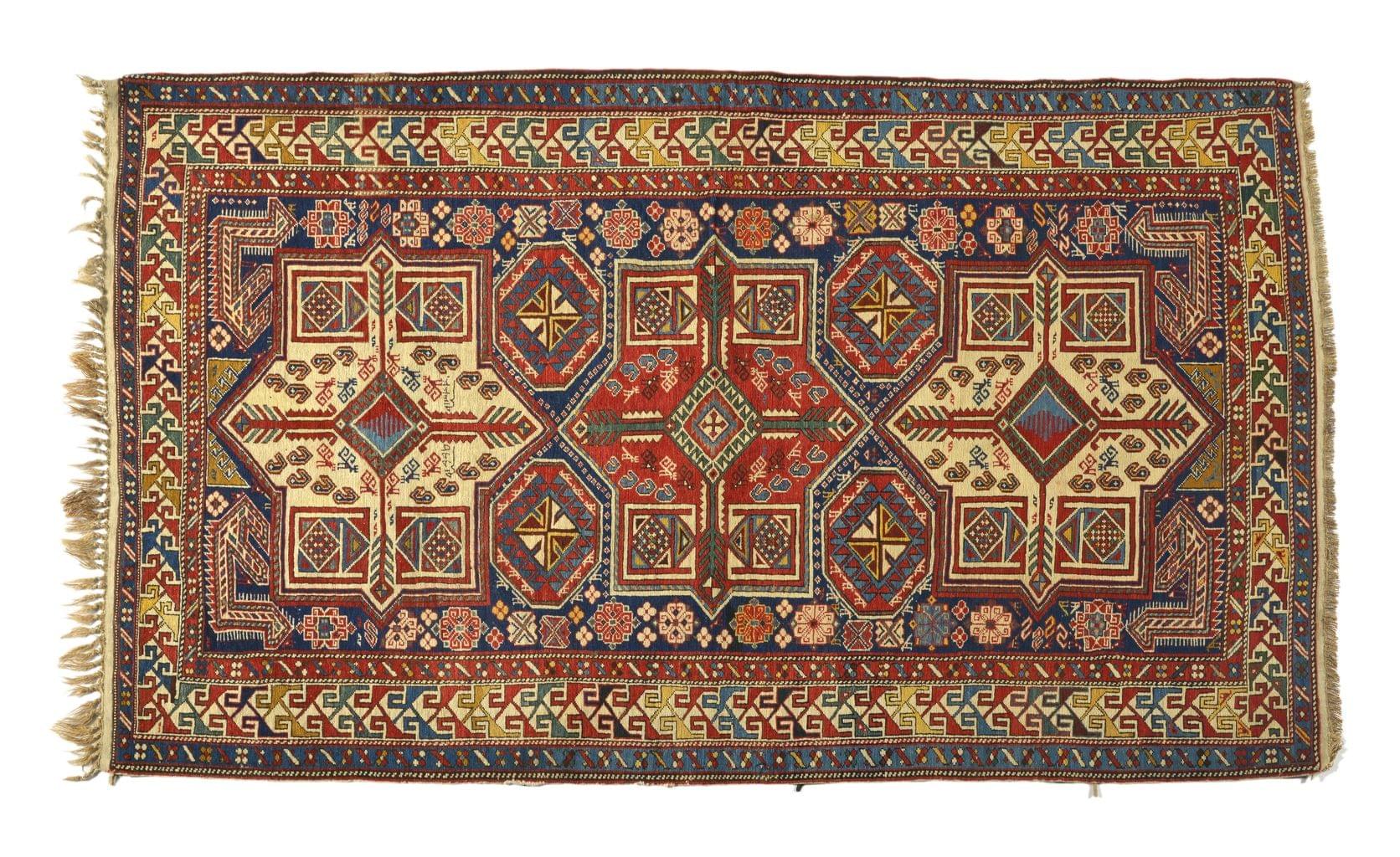Triple bordure, médaillon beige sur fond bleu et triple bordure, laine, 133x237 cm