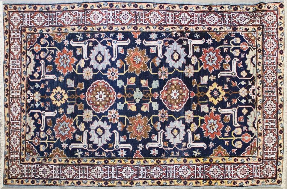 A décor de motifs floraux stylisés sur fond bleu nuit, bordure sur fond rouge brique, 126x197 cm