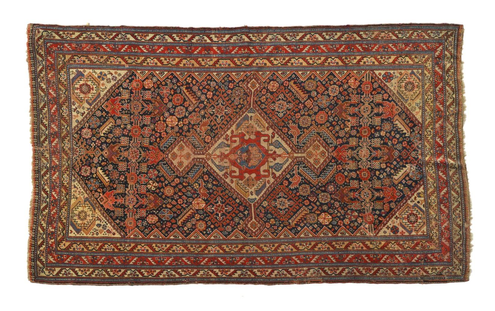 A motifs de médaillons losangiques sur fond rouge, bordure bleu...