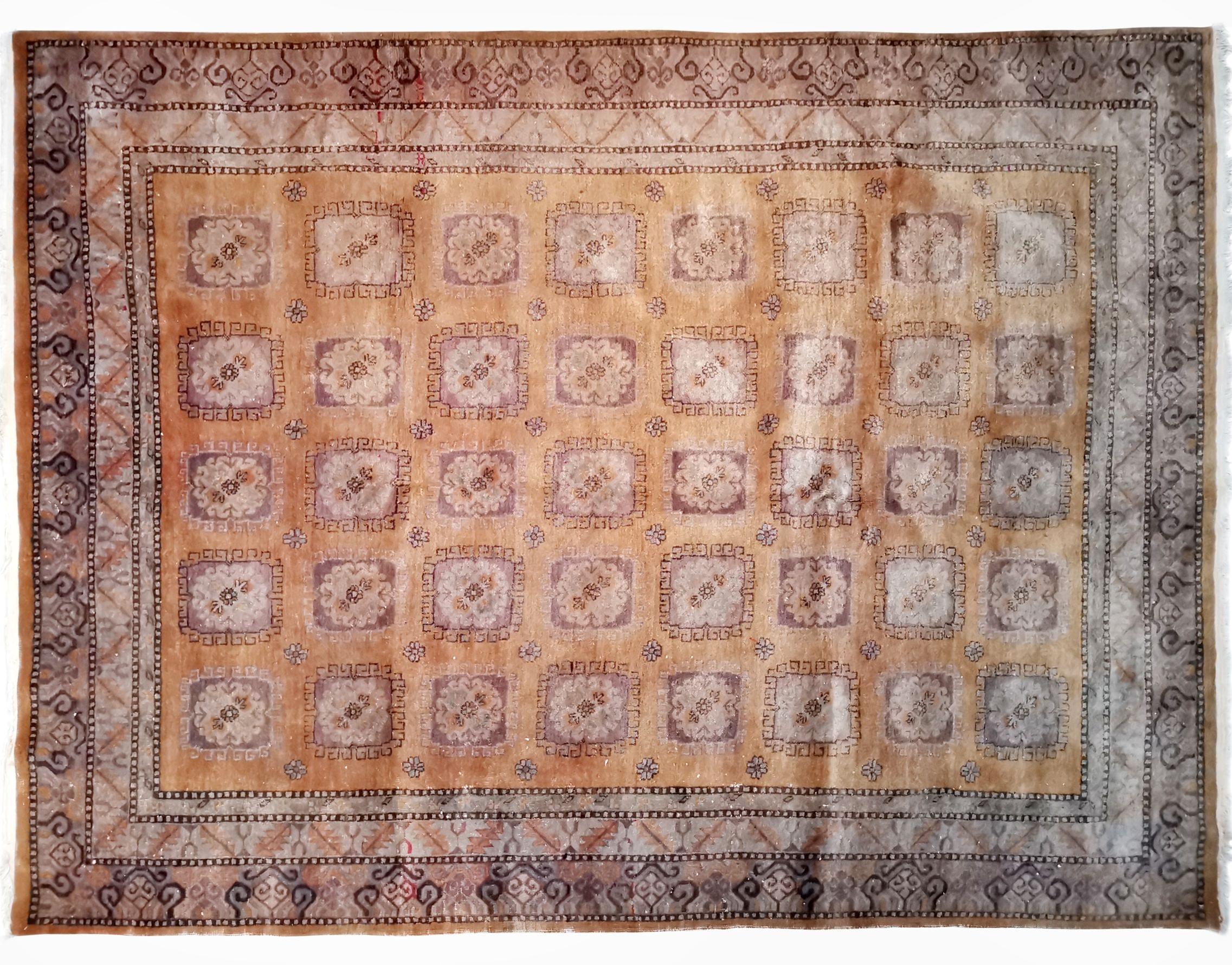 Laine à décor de médaillons géométriques sur fond ocre, bordure multiple sur fond vert, 268x184 cm