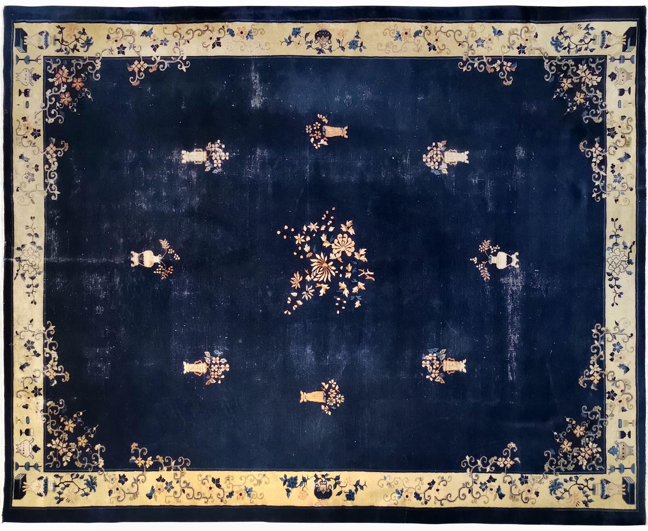 Laine à motif de vases sur fond bleu à bordure crème, 310x400 cm