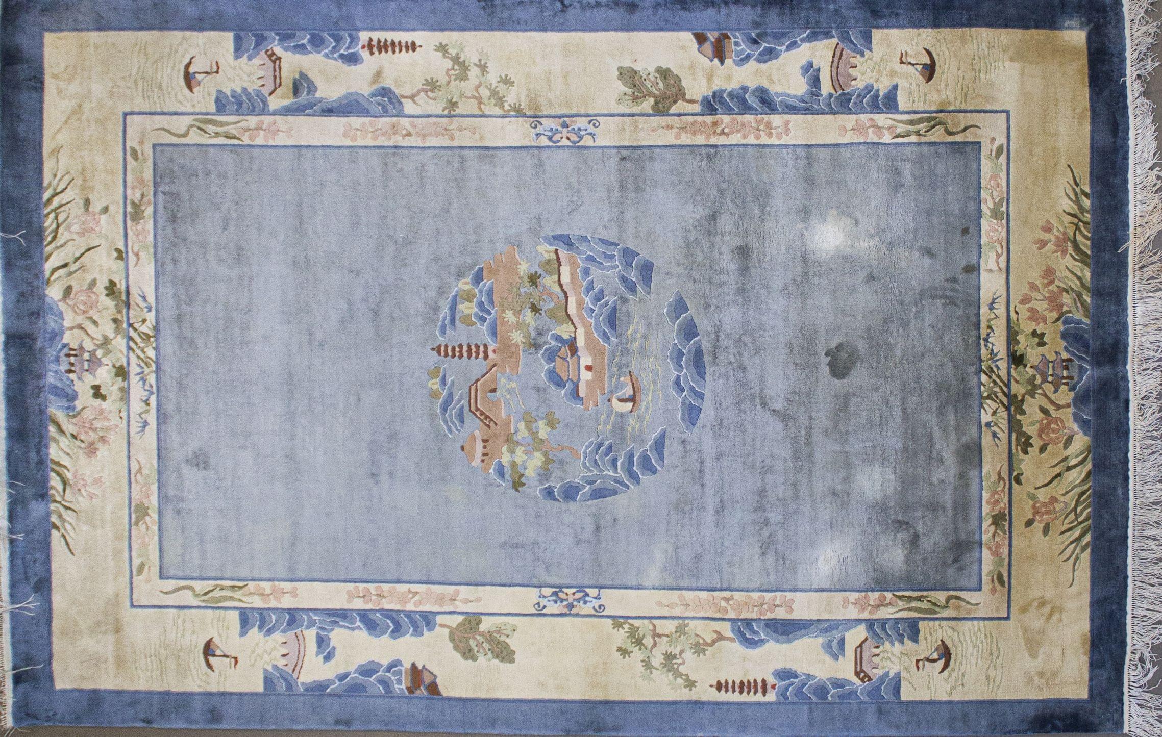 Laine à décor d'un médaillon central d'un paysage animé, bordure à décor de pagodes, ponts et jonques dans des paysages marins à fond or, 235x169 cm