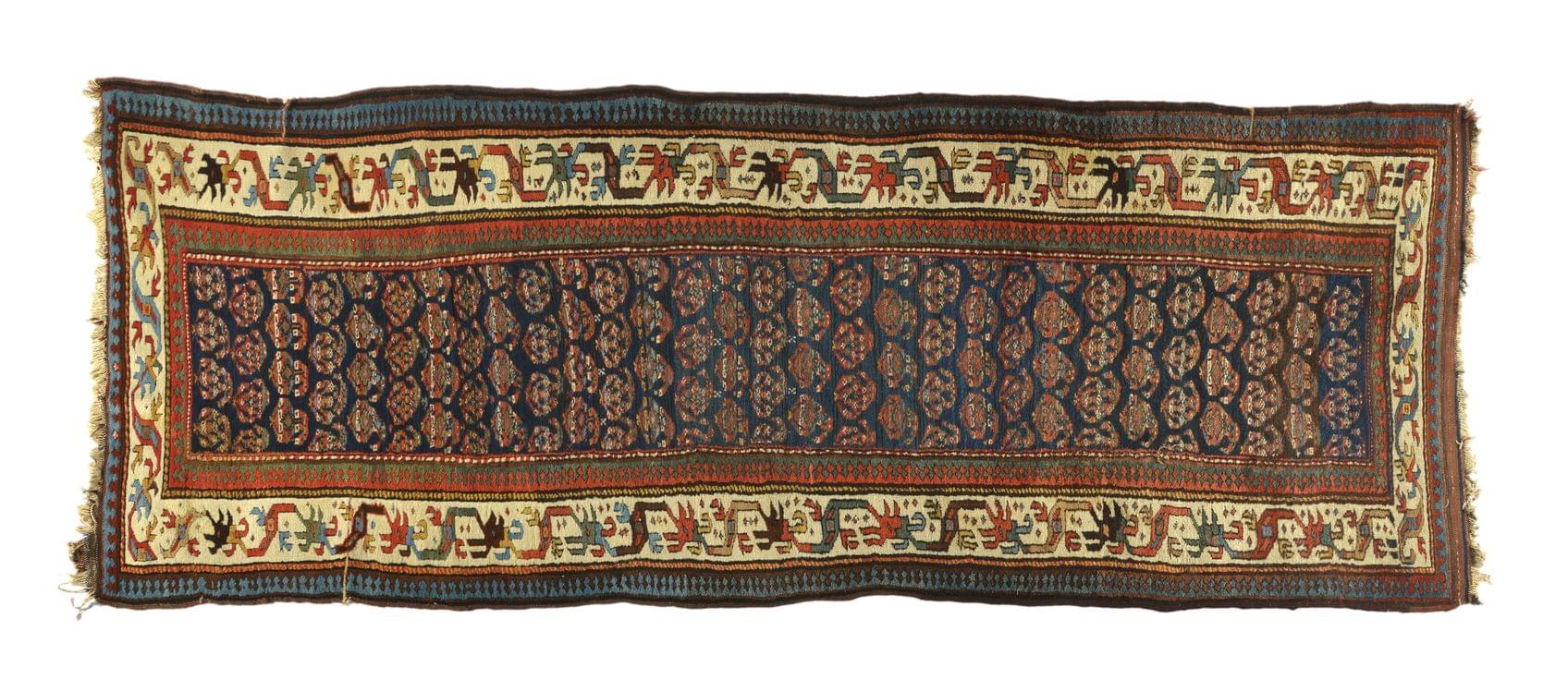 A motifs polychromes sur fond bleu ciel, laine179x297 cm