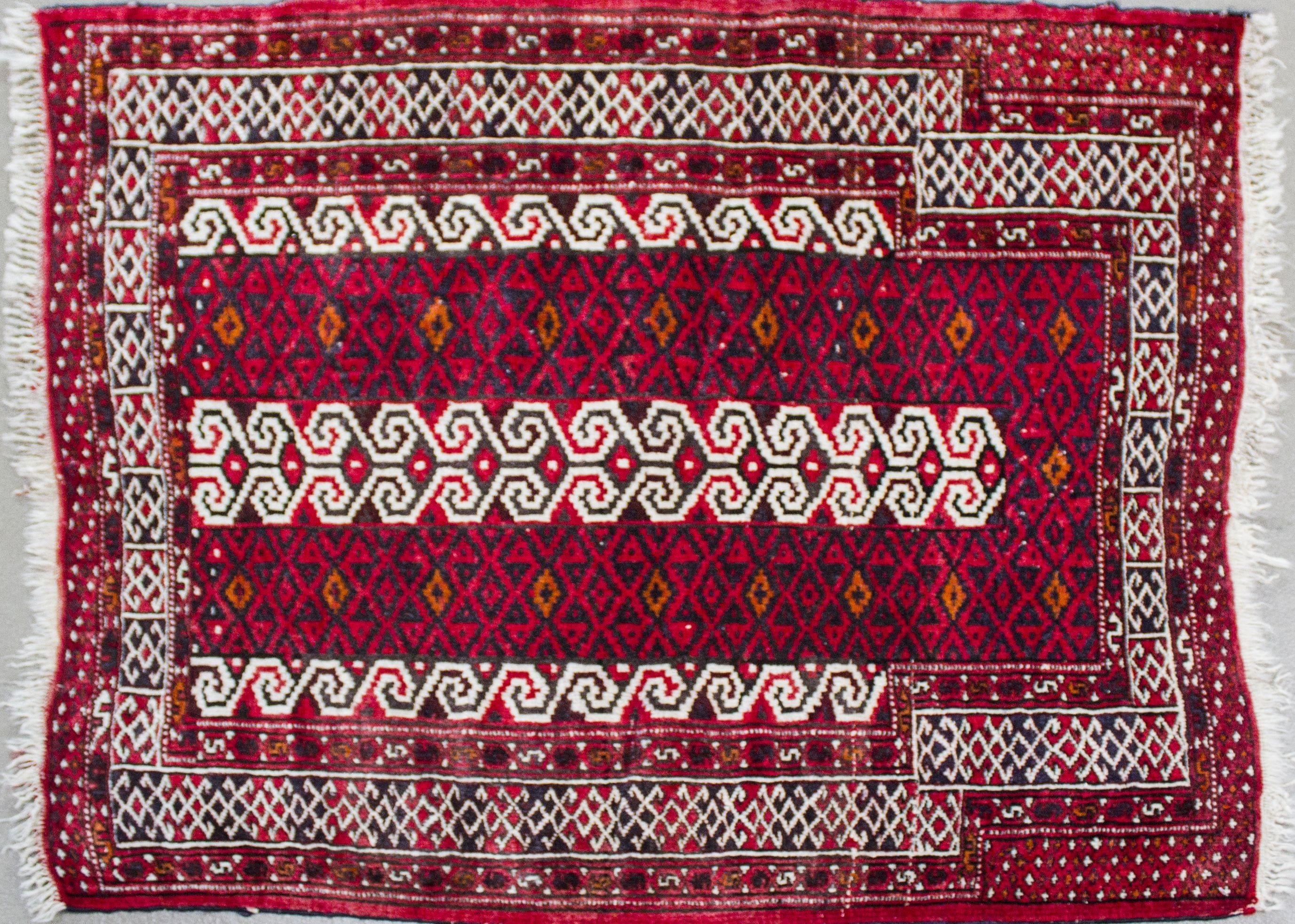Laine à décor géométrique sur fond rouge, 108x93 cm